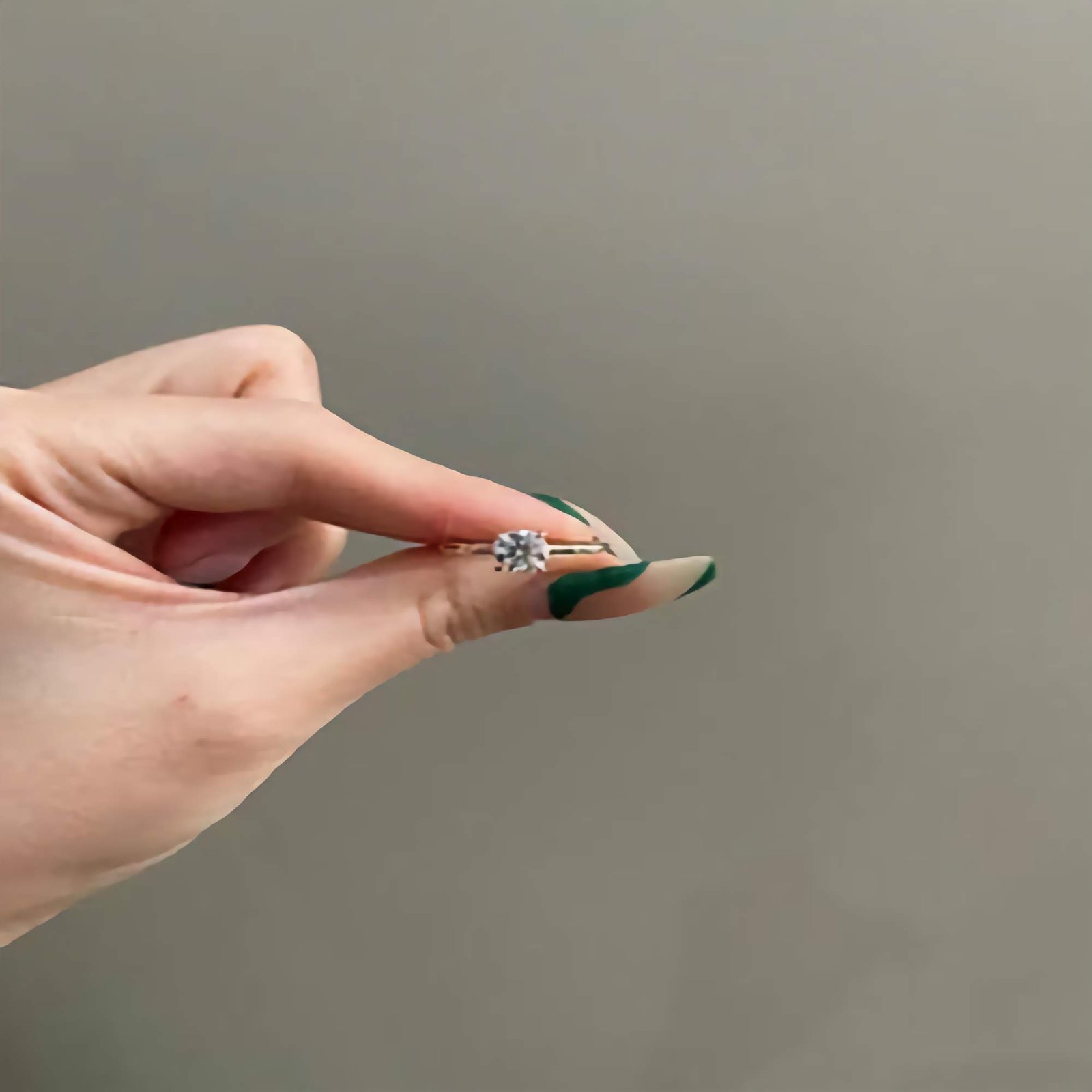 1CT round-cut CZ solitaire engagement ring in 925 sterling silver with 14K Gold or Rose Gold plating. Hypoallergenic and ships in 7–8 business days.