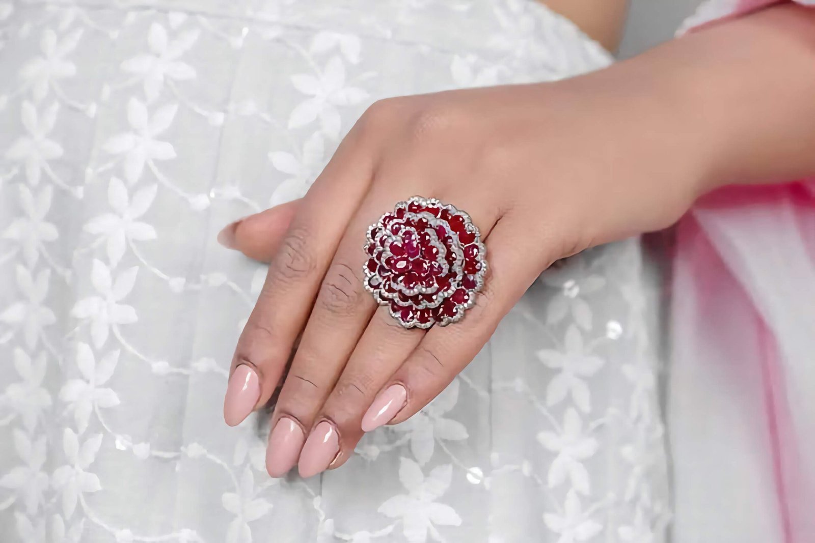 The band features a captivating floral motif adorned with high-grade cubic zirconia stones that mimic the sparkle of real diamonds. Each petal and accent is intricately placed to create a dimensional, eye-catching look that exudes elegance and confidence. Whether worn for a special occasion or styled to elevate your everyday ensemble, this cocktail ring commands attention with its graceful charm and luminous shine.
