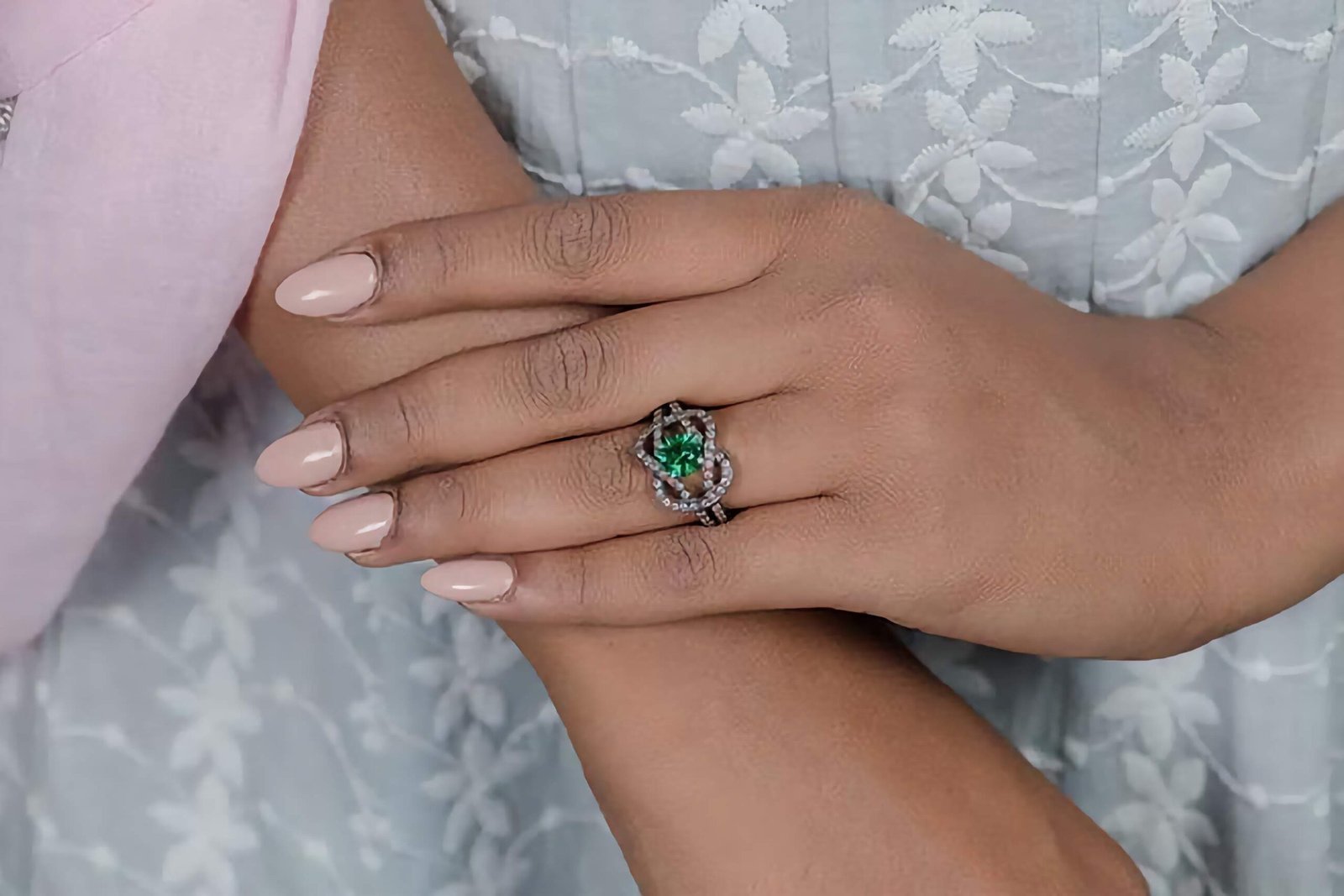 At the heart of the design lies a richly colored emerald-green cubic zirconia, expertly cut to reflect light with every movement. The vivid centerpiece is enhanced by sparkling, high-grade diamond-like zirconia, adding brilliance and contrast to this sophisticated piece. Whether worn solo or styled with other rings, it delivers a classic touch with a vibrant twist.