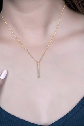 The pendant features a slim, vertical rod silhouette enhanced with high-grade, diamond-like cubic zirconia for a subtle sparkle that catches the light just right. Its clean lines and compact form make it ideal for layering with other pieces or wearing solo for an effortlessly chic look.