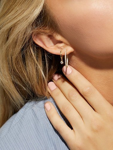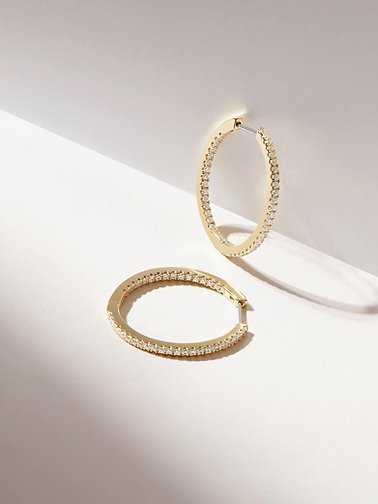 925 sterling silver pave hoop earrings with sparkling cubic zirconia. Coated in 14K gold or rose gold plating. Hypoallergenic. Ships in 7–8 business days.