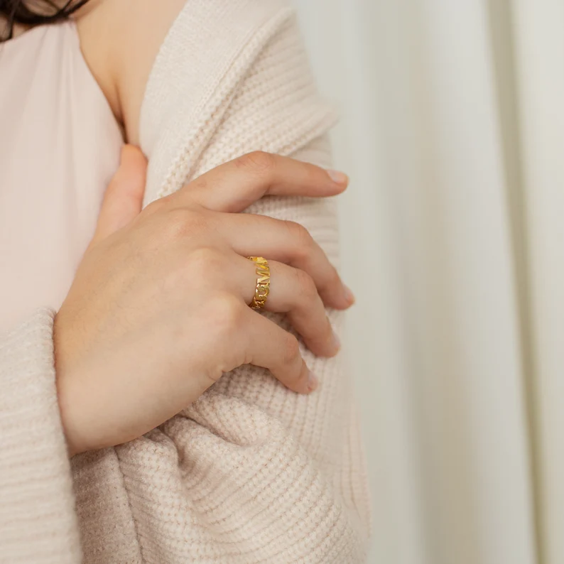 Finished with a thick, durable layer of 14K Gold or Rose Gold plating, this ring offers a rich shine that’s built to last. To enhance its brilliance, the highest-grade Cubic Zirconia stones are delicately set, creating a diamond-like sparkle that catches the light perfectly. Thoughtfully designed to be nickel-free and hypoallergenic, it ensures a comfortable wear for even the most sensitive skin. Perfect for layering or wearing solo, this curb chain name ring will add a bold, personalized touch to any outfit. Each piece is handcrafted with care and ships within 7–8 business days, with full support available through live chats and video calls. Redefine modern personalization with this standout design.