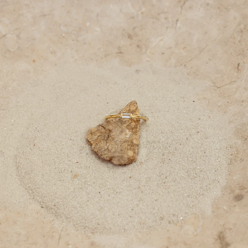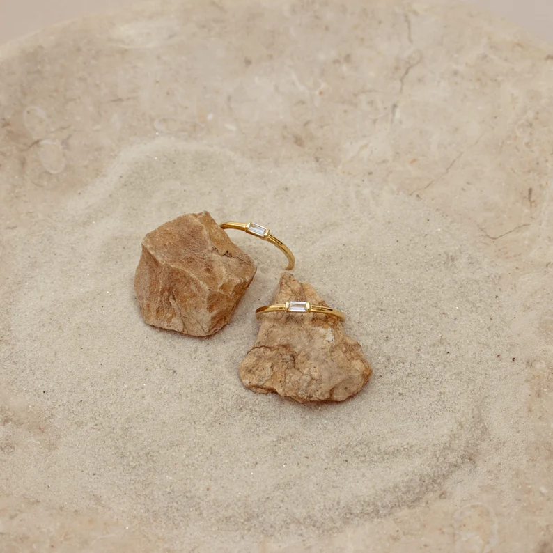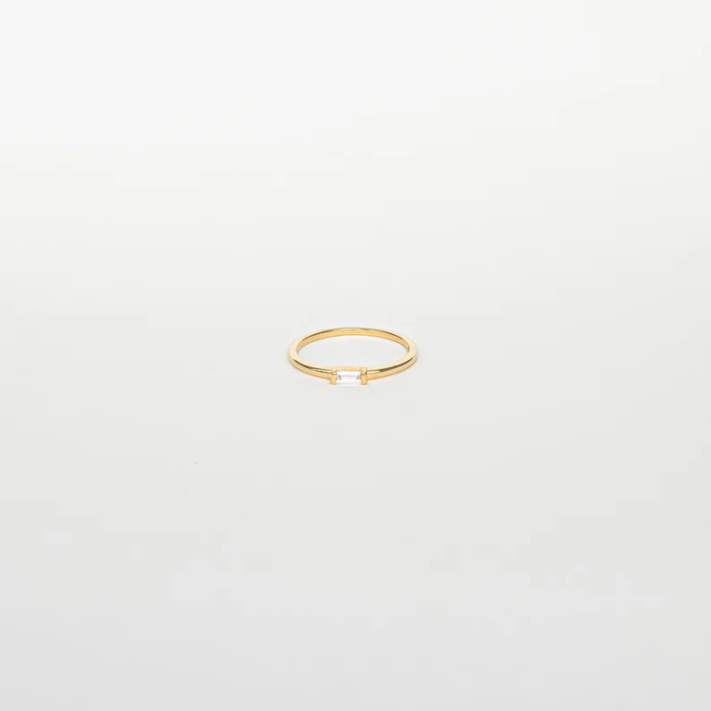 Add subtle sparkle with the Dainty Baguette Diamond Ring, crafted in sterling silver, gold plated, and finished with brilliant cubic zirconia for effortless elegance.