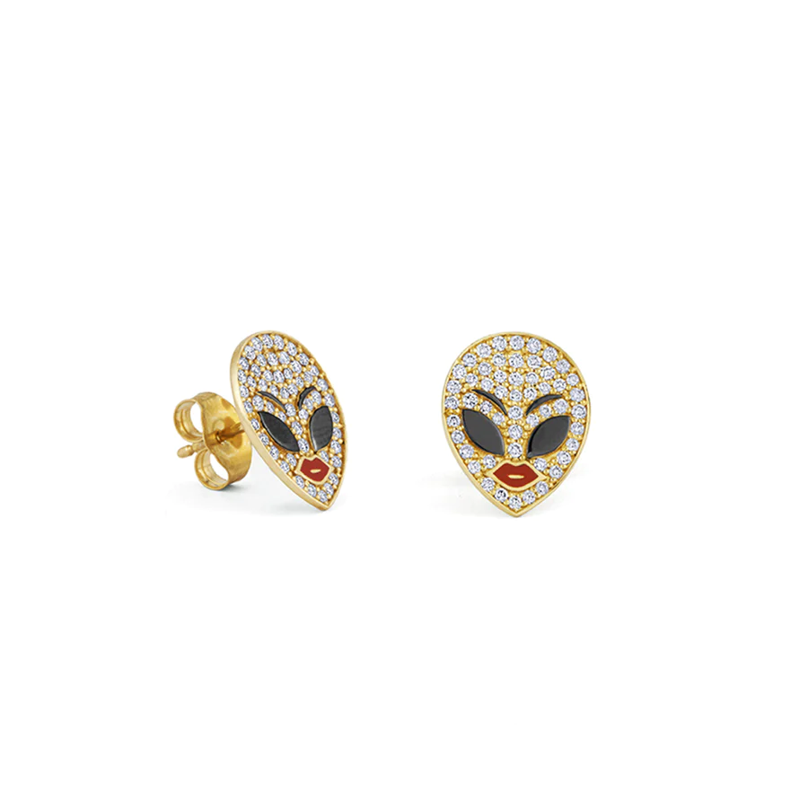 925 silver alien stud with CZ sparkle and thick 14K gold or rose gold plating. Unique, fun, hypoallergenic, and perfect for daily wear.
