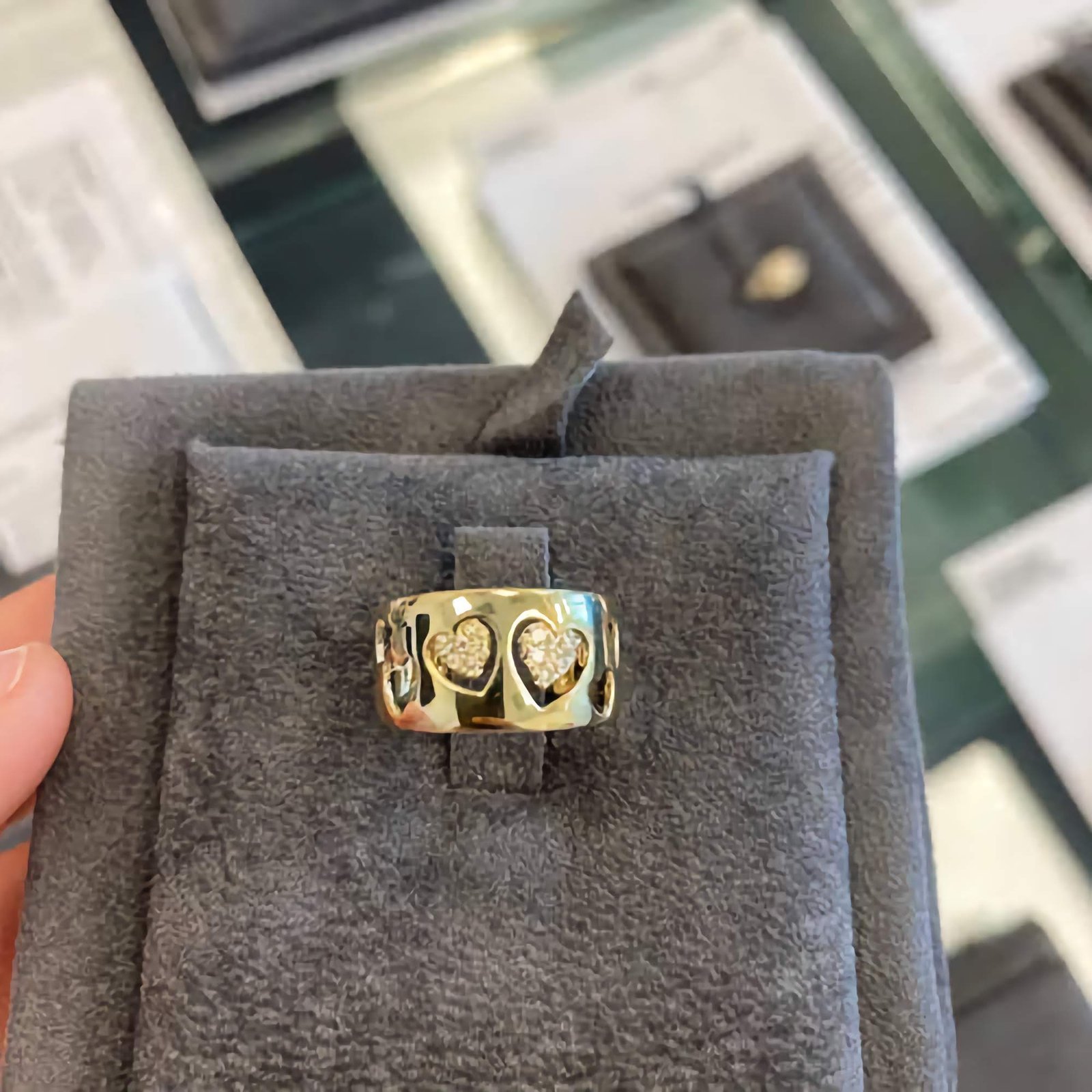 The real charm lies in the heart-shaped diamond accents delicately set across the band using the finest quality Cubic Zirconia. Each CZ stone mimics the brilliance of real diamonds, catching light from every angle while offering an ethical and affordable alternative. The ring blends elegance and playfulness, making it a stunning choice for those who love to wear their heart on their hand—literally.