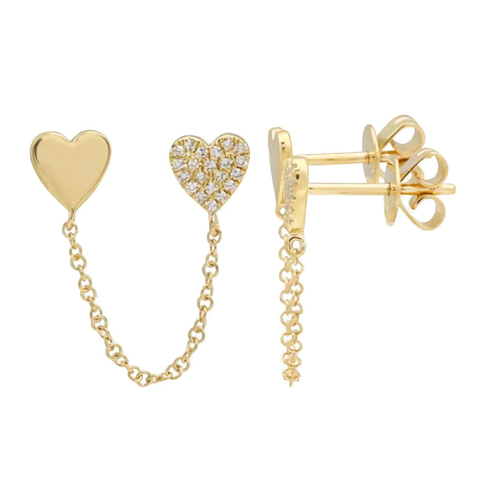 925 Sterling Silver chain earring featuring one solid heart and one CZ-studded heart, finished in 14K Gold or Rose Gold plating. Lightweight and hypoallergenic.