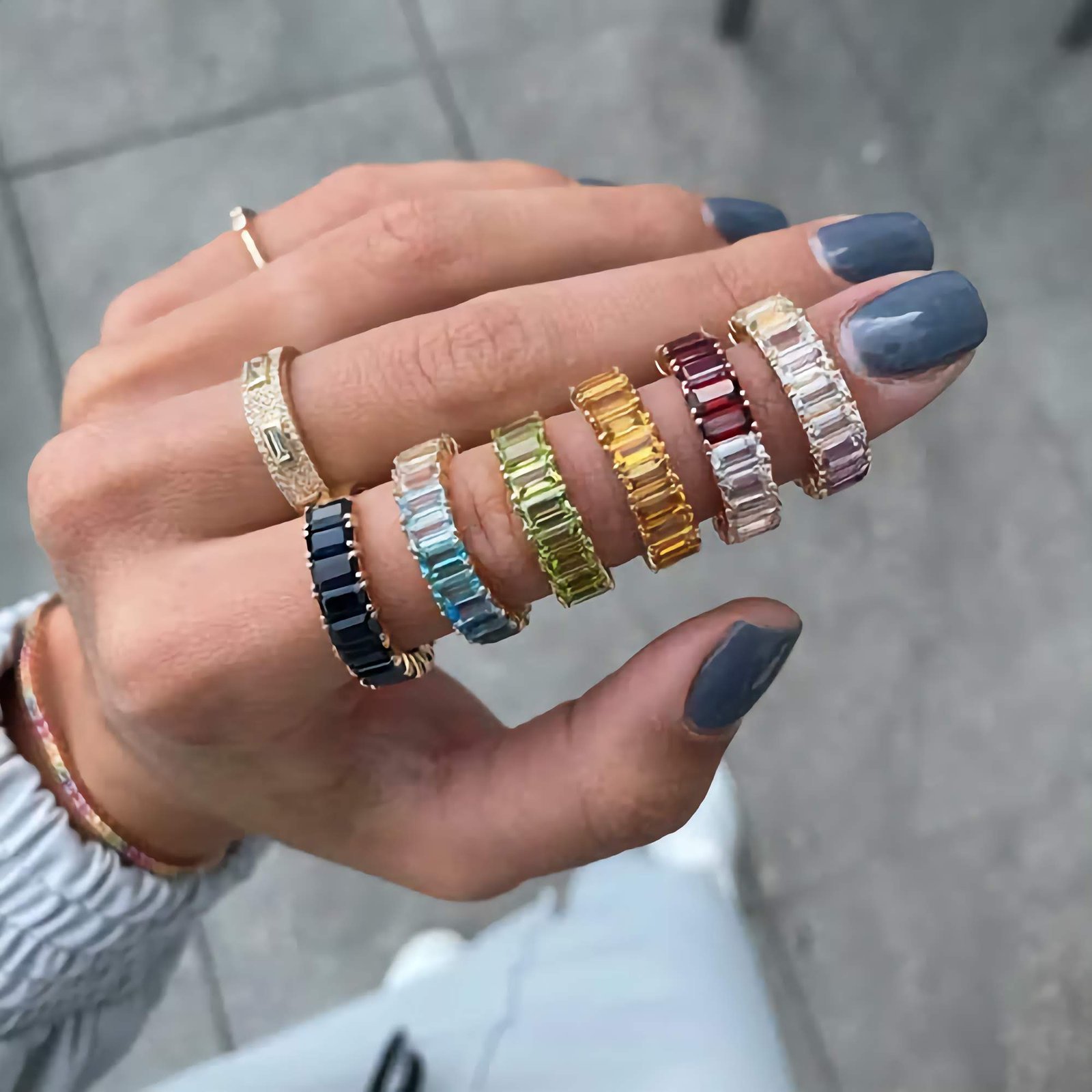 925 Sterling Silver eternity band with emerald-cut citrine CZ stones and 14K Gold or Rose Gold plating. Hypoallergenic, radiant, and joyful.