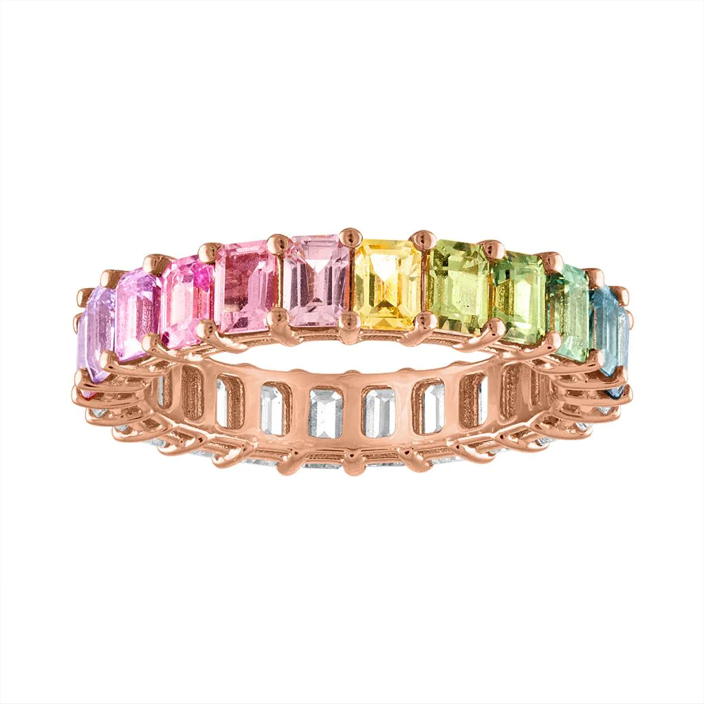 The Swarish Jewels Emerald Cut Multicolor/Diamond Eternity Band is vibrant and stylish. The multicolor gemstones are beautifully set.