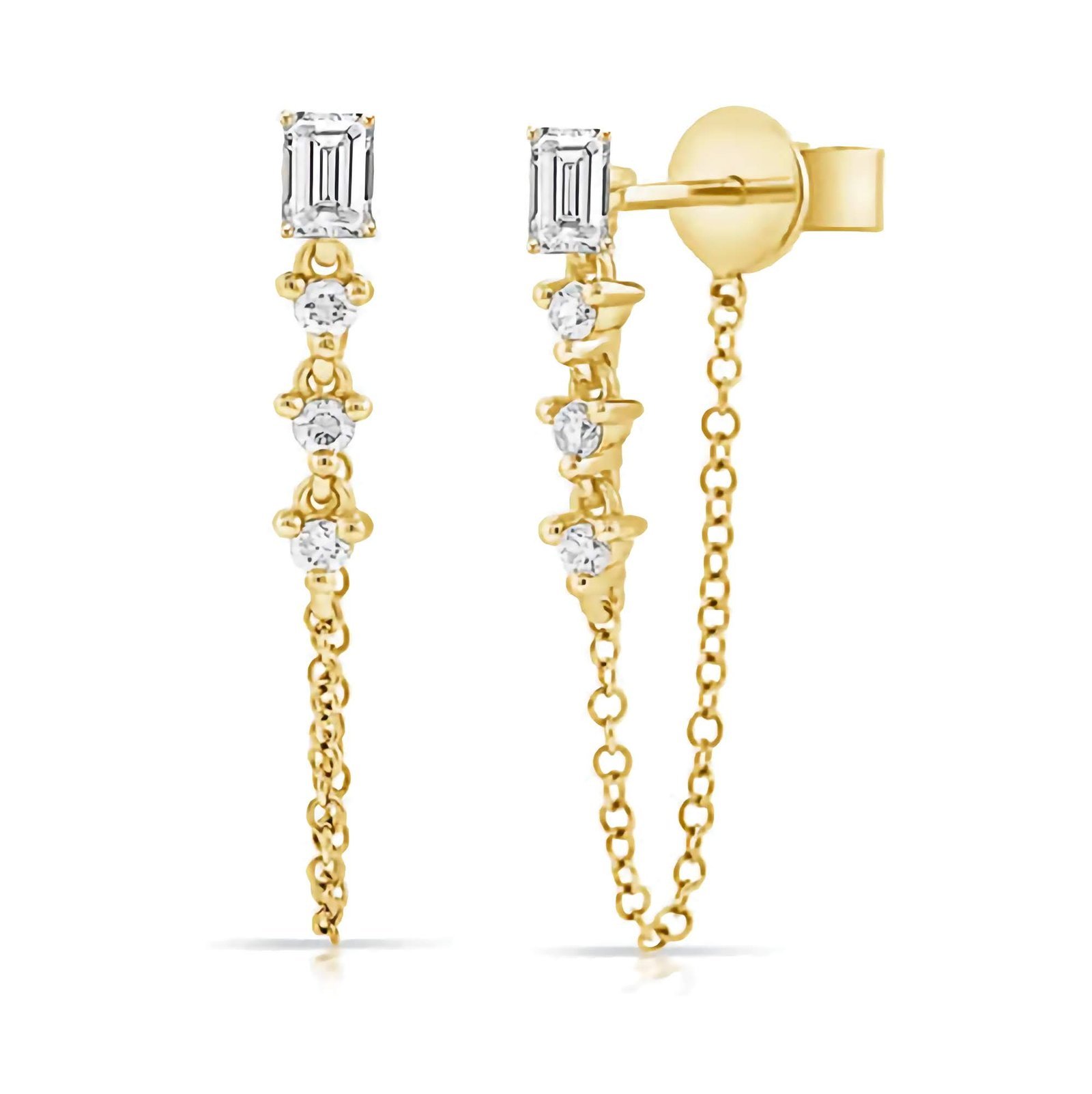 Refined and radiant, the 925 Silver Emerald Cut Stud Statement Drop Link Chain Earrings from Swarish Jewels are crafted to make a lasting impression. Made from high-quality 925 Sterling Silver and finished with thick, durable 14K Gold or Rose Gold plating, these earrings offer brilliance and strength in a fashion-forward silhouette.
