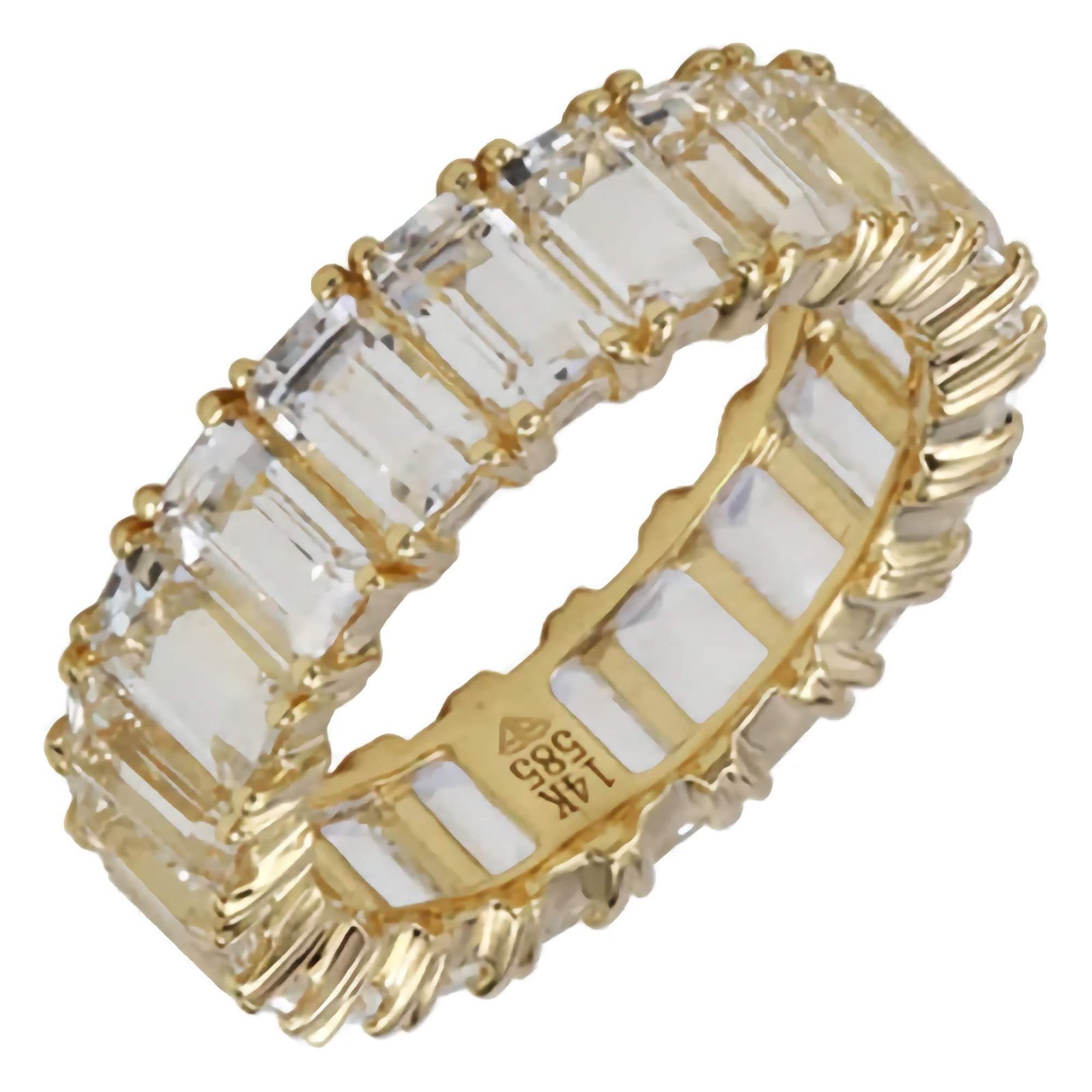 The band is adorned with a continuous row of emerald-cut Cubic Zirconia stones in a crisp white topaz hue. Each stone is precision-cut for clarity and brilliance, offering a diamond-like sparkle with a clean, modern aesthetic. The elongated emerald cuts lend a sense of structure and sophistication, making this piece ideal for both solo wear and stacking.