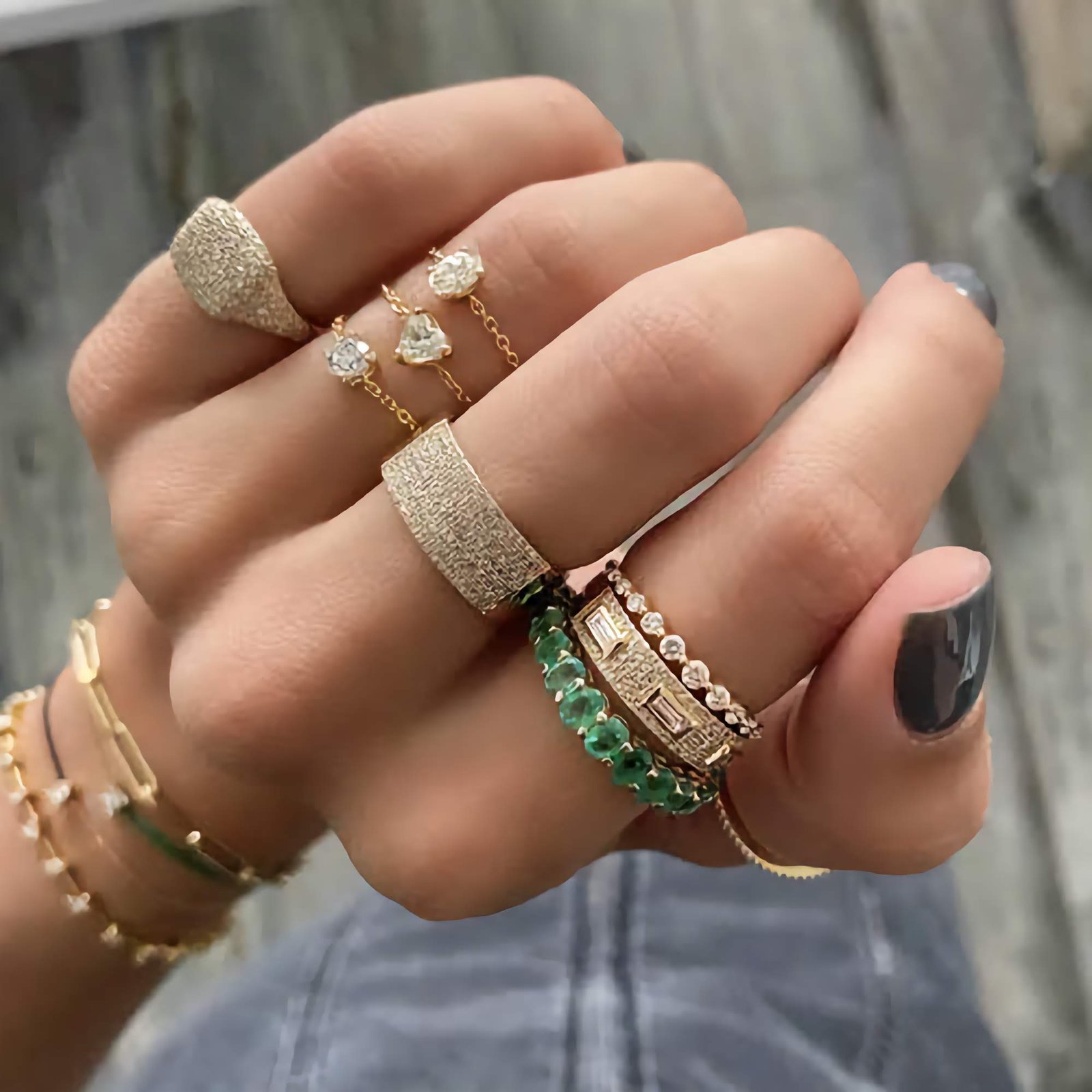 The eternity band is adorned with a continuous circle of rich emerald-green Cubic Zirconia stones, precision-cut to enhance their natural brilliance. The deep green hue is symbolic of growth, harmony, and prosperity, making this ring not just a fashion statement, but a piece filled with intention. The seamless row of stones signifies everlasting love and unbroken beauty.