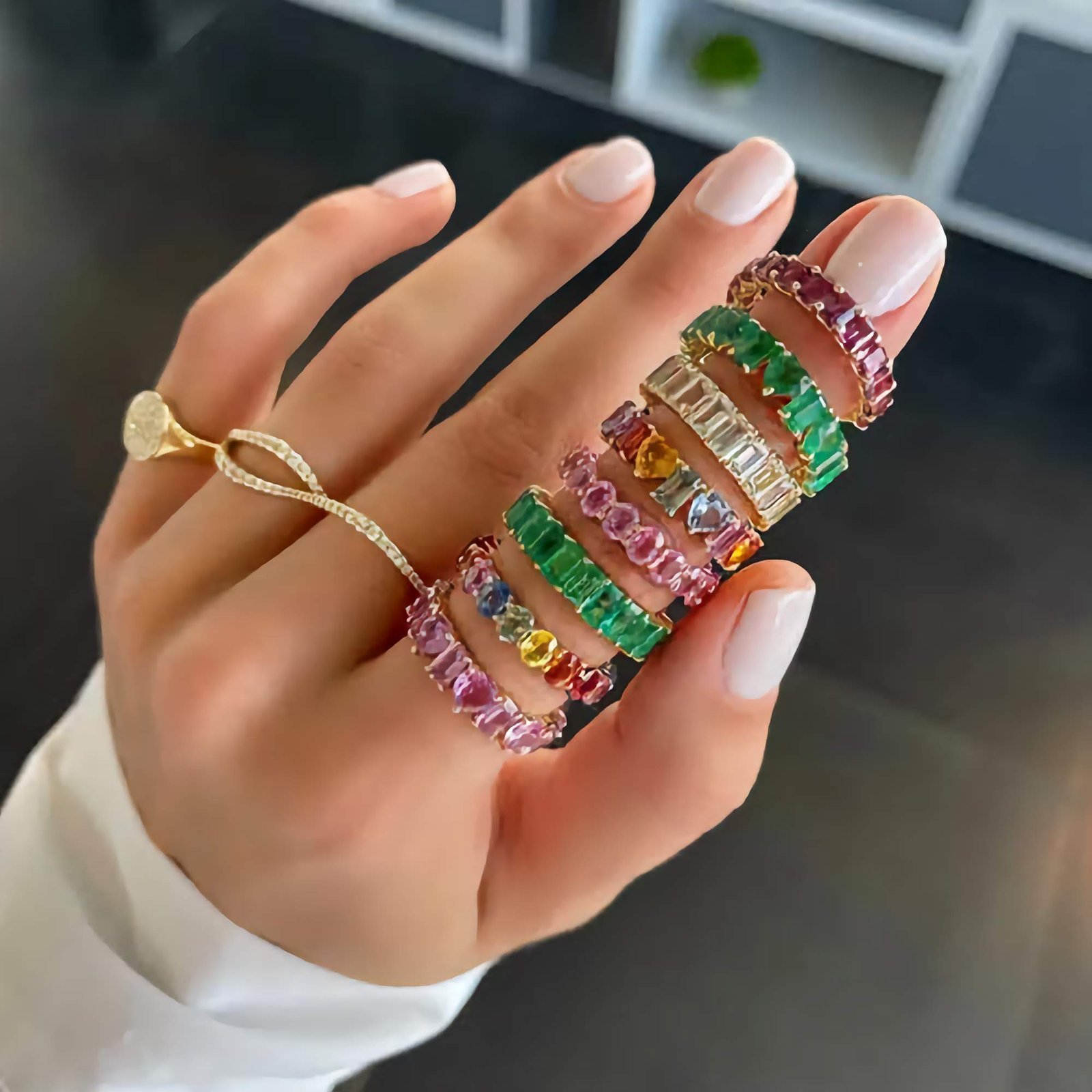 Nickel-free and hypoallergenic, it’s perfect for sensitive skin and light enough for everyday wear. Whether stacked with your favorite rings or worn solo for maximum impact, the Emerald Eternity Ring offers timeless luxury with a fresh pop of color.