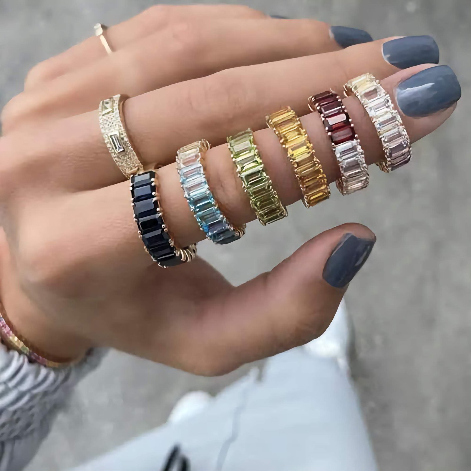 925 Sterling Silver eternity band with emerald-cut blue ombre CZ stones and 14K Gold or Rose Gold plating. Hypoallergenic, radiant, and modern.