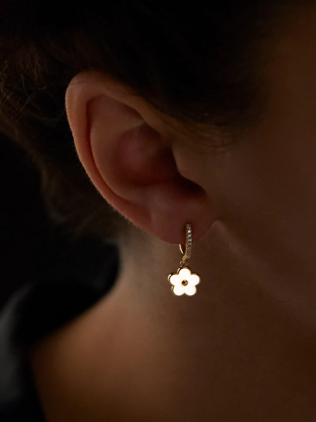 The design features delicate flower-shaped accents, adorned with highest-grade cubic zirconia that provides a sparkling, diamond-like finish. Lightweight, nickel-free, and hypoallergenic, these earrings are designed for sensitive skin, ensuring comfort all day long. Whether worn casually or for a special occasion, the Glow Flower Hoops add a unique and timeless charm to any look.