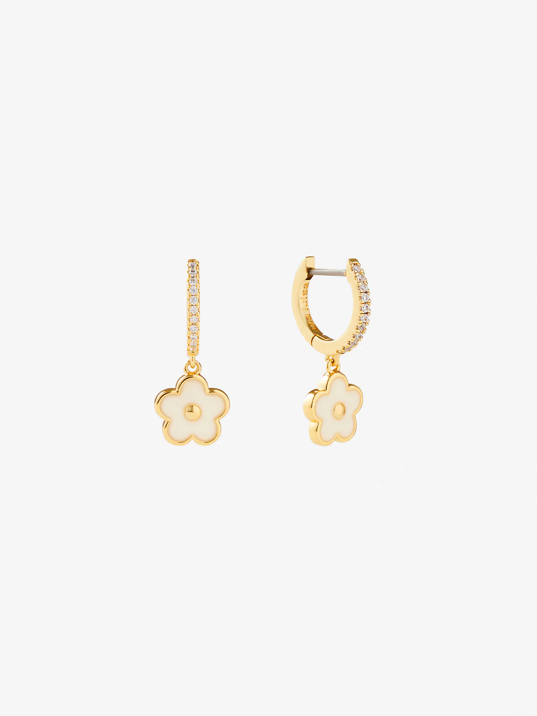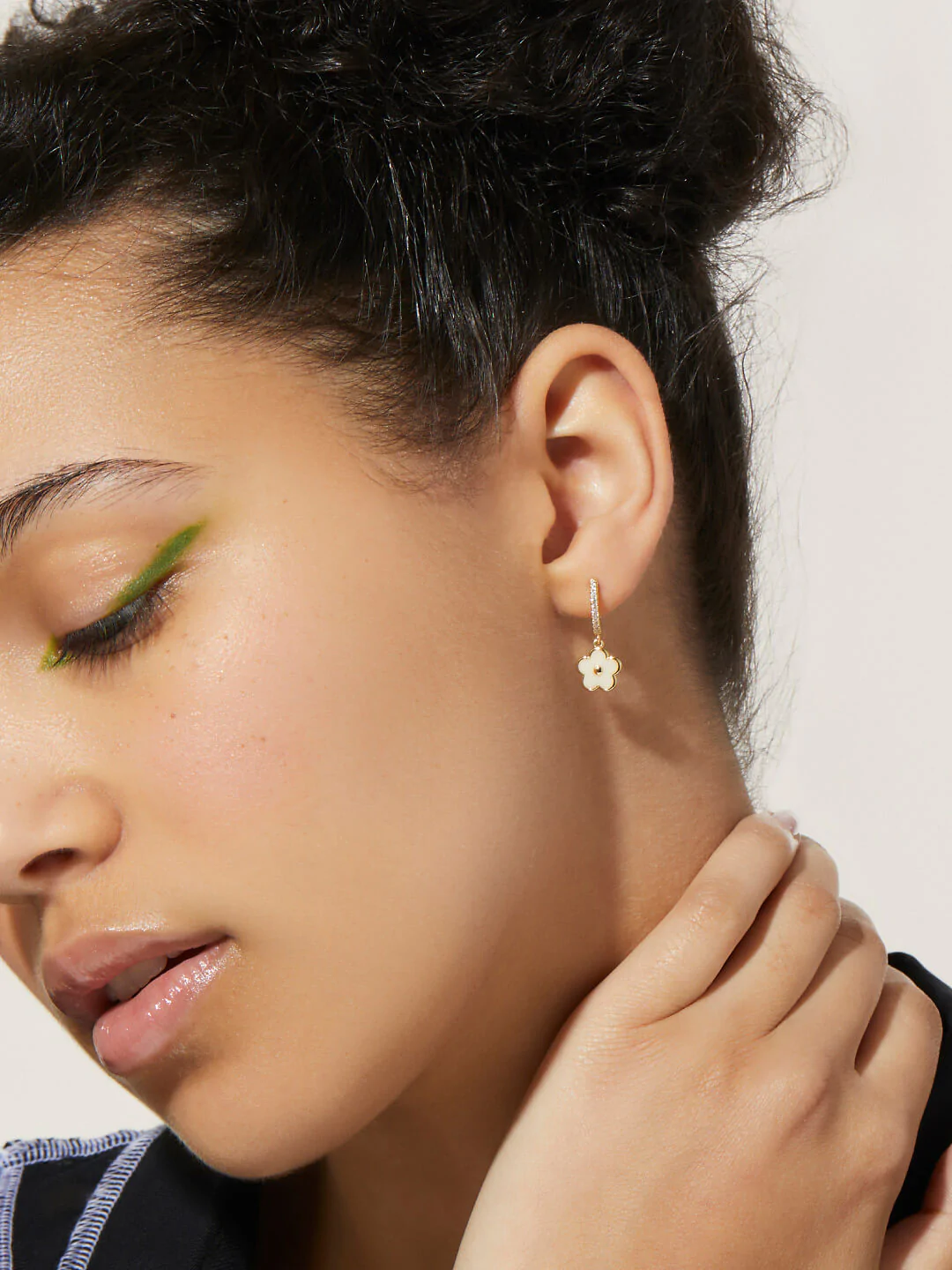 925 sterling silver Glow Flower Hoops with sparkling cubic zirconia. Finished with thick 14K gold or rose gold plating. Hypoallergenic. Ships in 7–8 business days.