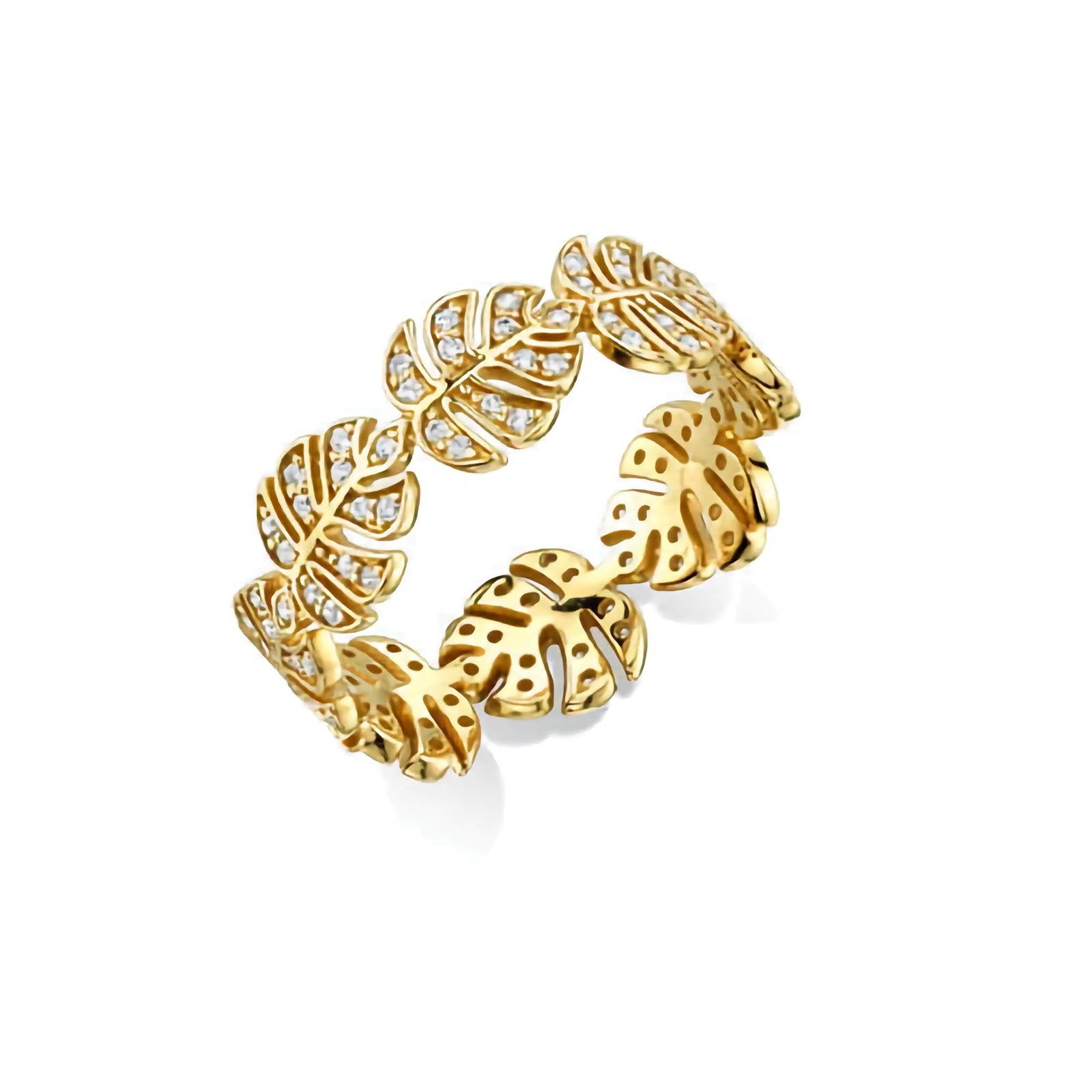 Botanical CZ eternity ring featuring monstera leaves in 925 sterling silver with 14K Gold or Rose Gold plating. Hypoallergenic and ships in 7–8 business days.