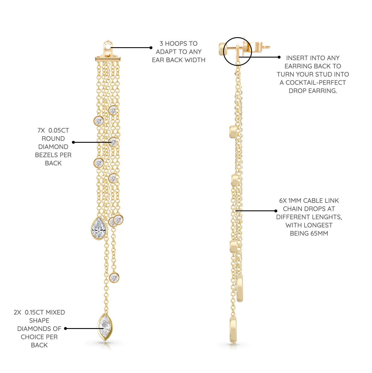 The design features a cascade of bezel-set Cubic Zirconia in mixed shapes—round, marquise, pear, and more—strung together into a tassel-like drop. Each stone offers a diamond-like sparkle, creating a fluid shimmer that moves gracefully with you. The mixed shapes add visual intrigue, making this piece perfect for statement styling without overwhelming your look.