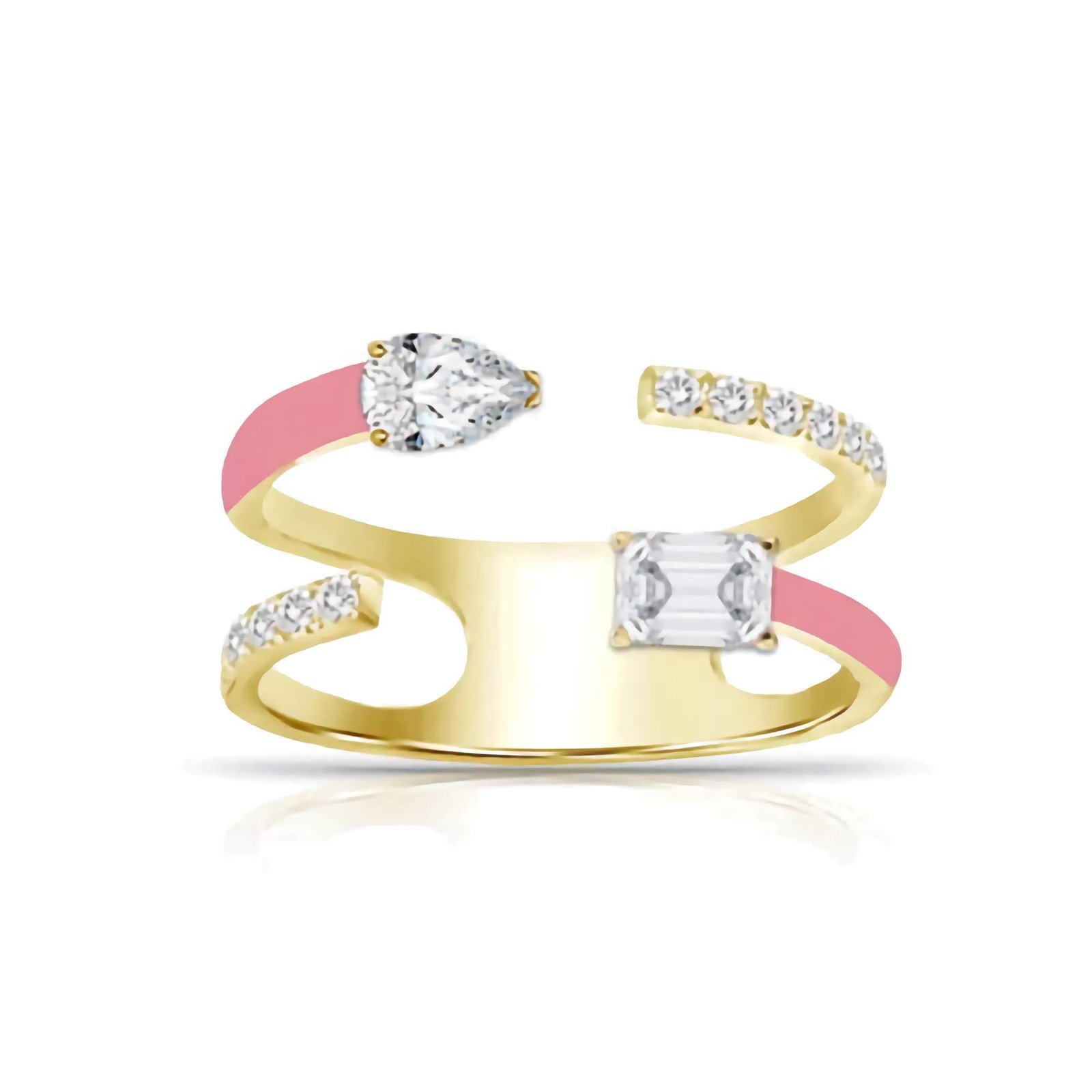 The standout feature is the fusion of vibrant enamel detailing and multi-shaped high-grade Cubic Zirconia stones arranged in two luxurious rows. Each stone—ranging from round to marquise to baguette—is set to perfection, adding depth and dimension to the piece. The colorful enamel brings a playful edge to the refined brilliance of the CZ stones, making this ring a true statement-maker.