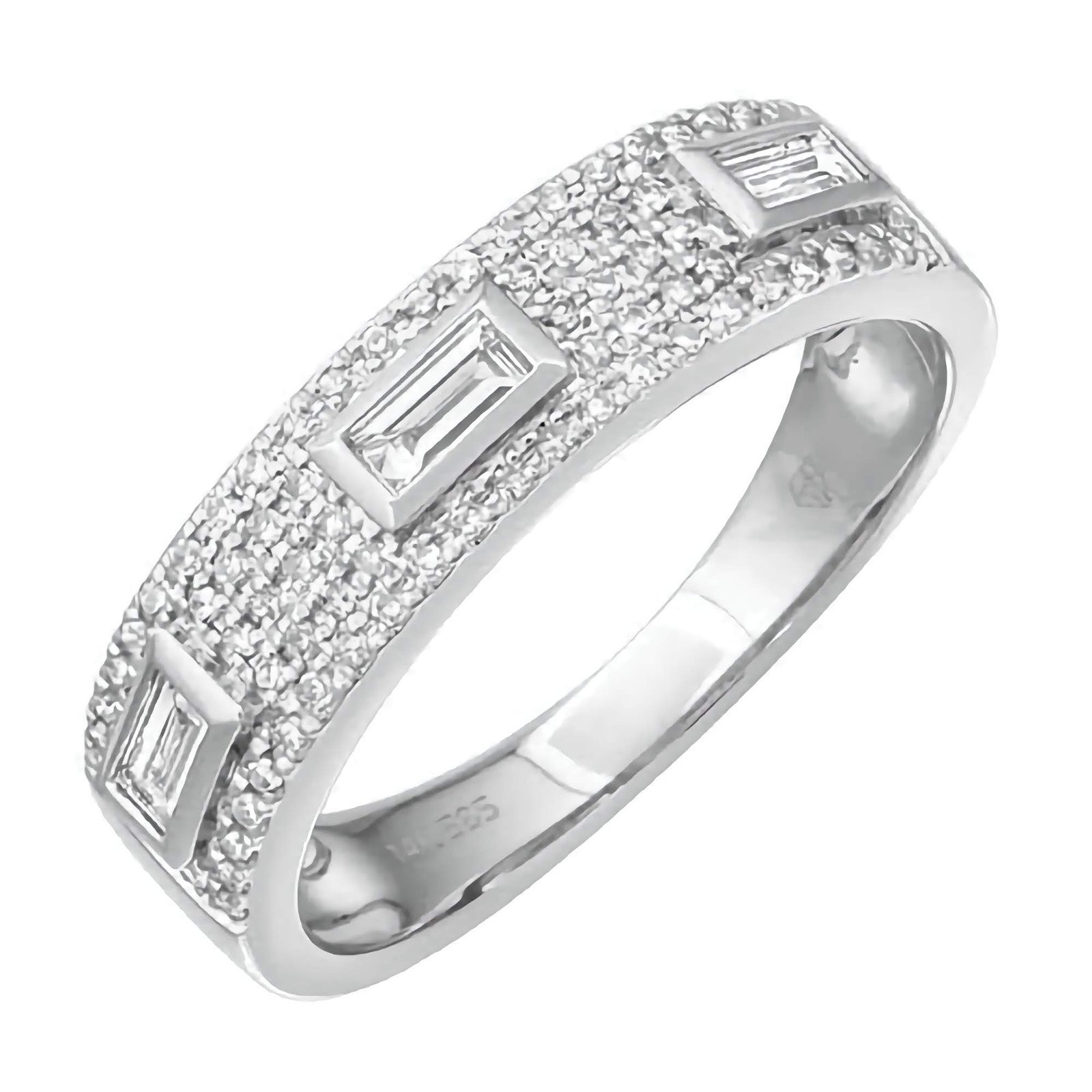 The design features a wide band encrusted with rows of shimmering Cubic Zirconia stones in a combination of pave and baguette cuts. The contrast between the classic round sparkle and clean, structured baguettes creates dynamic texture and a high-fashion edge, perfect for making a statement without saying a word.