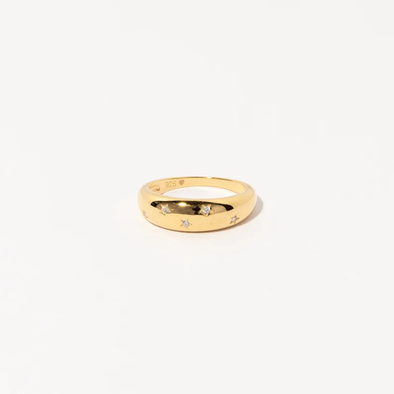 Capture the beauty of the night sky with the 925 Silver Star Dome Ring, crafted in sterling silver, gold plated, and finished with sparkling cubic zirconia.