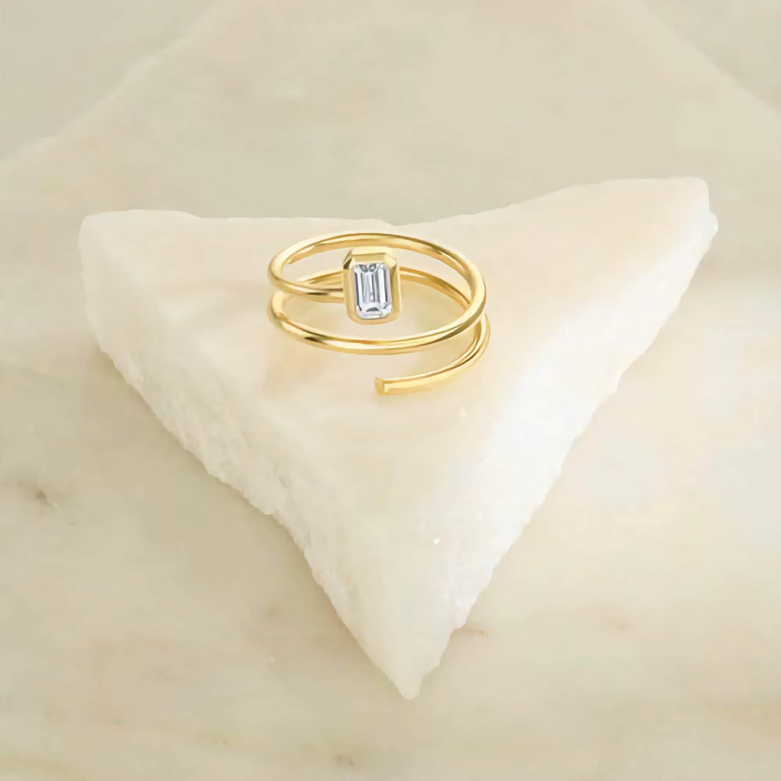 925 silver spiral ring with bezel-set CZ stones, finished in 14K gold or rose gold. Hypoallergenic, nickel-free, and effortlessly elegant.