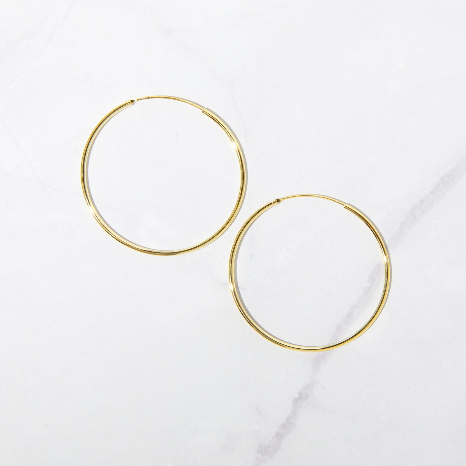 Crafted from high-quality 925 sterling silver, these hoops are finished with a thick layer of 14k gold plating for a luxurious shine that lasts. The 43mm inner diameter gives them a graceful presence that frames the face beautifully, while the slim 1.7mm thickness keeps the look sleek and refined. The model is wearing the 43mm size, showcasing how these hoops make a statement without feeling too bold.