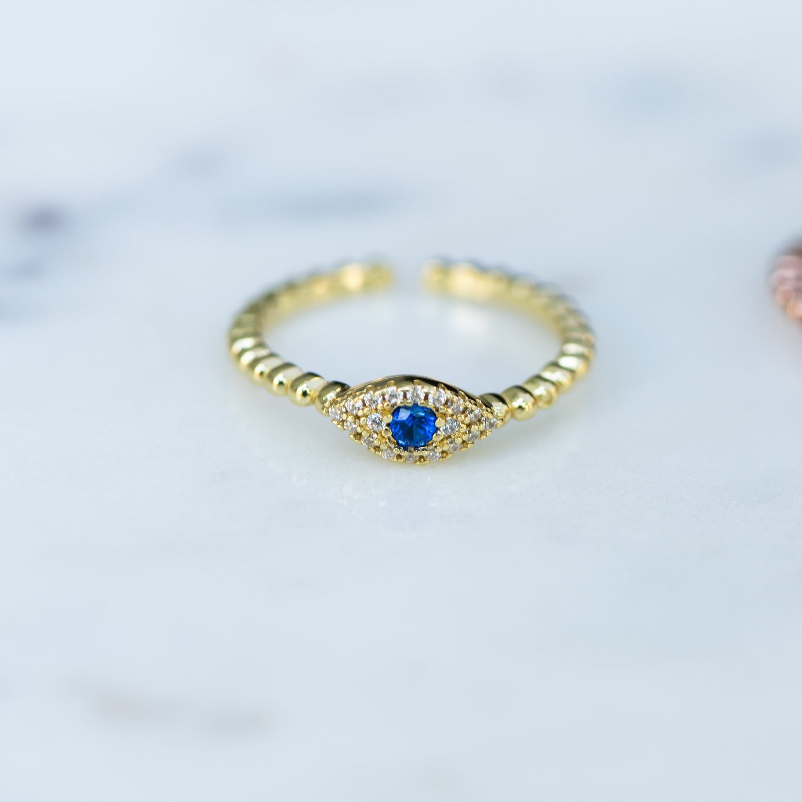 - Beaded evil eye ring featuring an adjustable band makes this ring perfect for stacking