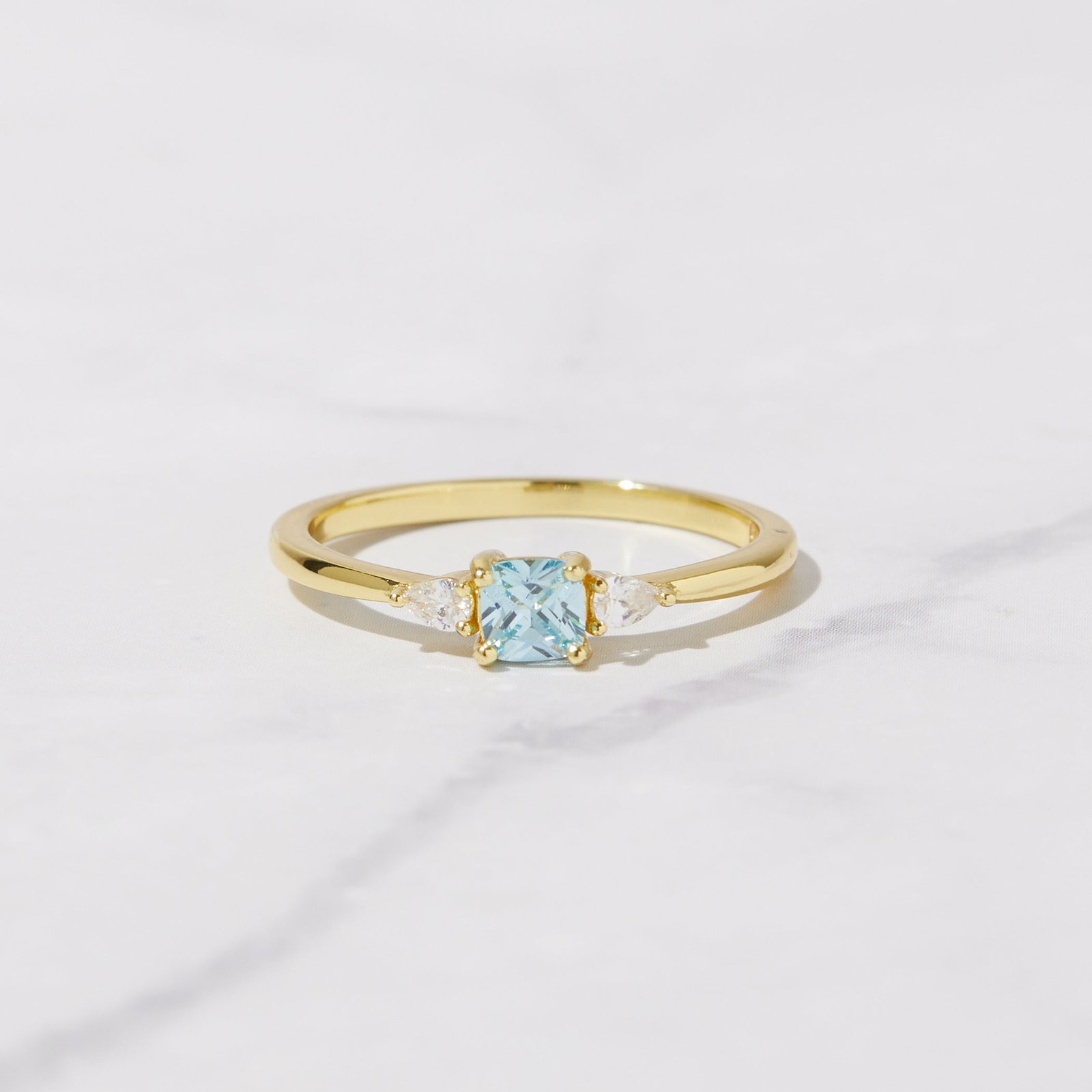 925 silver aquamarine cushion ring with 3.6mm CZ stone and thick 14k gold plating. Dainty, hypoallergenic, and also available in pink, yellow, and emerald.