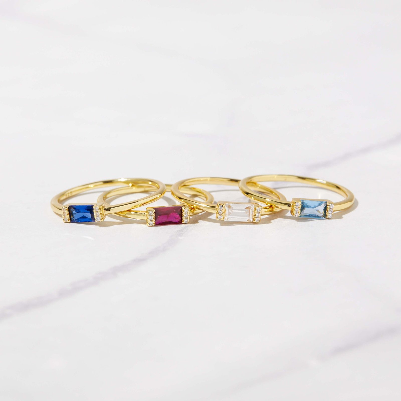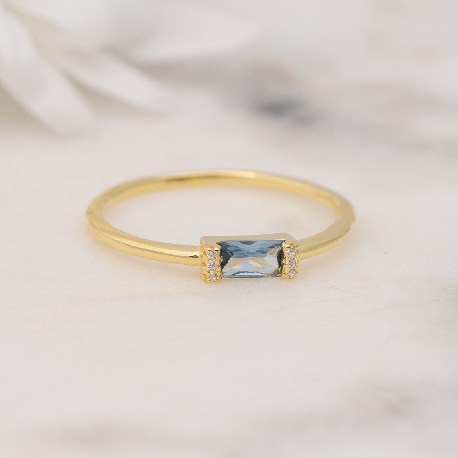 925 silver aquamarine baguette ring with 5x3mm CZ and thick 14k gold plating. Dainty, stackable, hypoallergenic, and available in sizes 4–10.