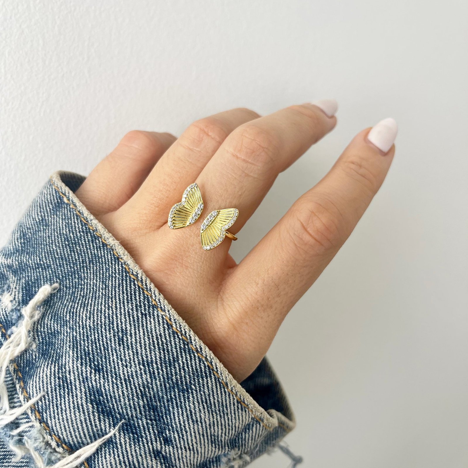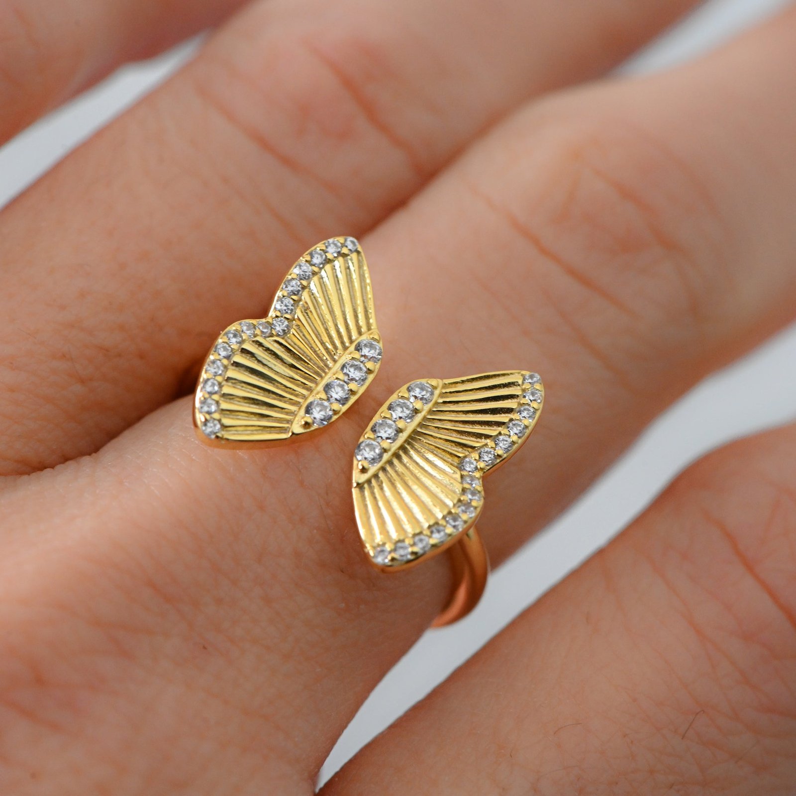 925 silver butterfly ring with 14k gold plating. Dainty, adjustable (sizes 7–12), hypoallergenic, and beautifully symbolic with a 14.7mm design.