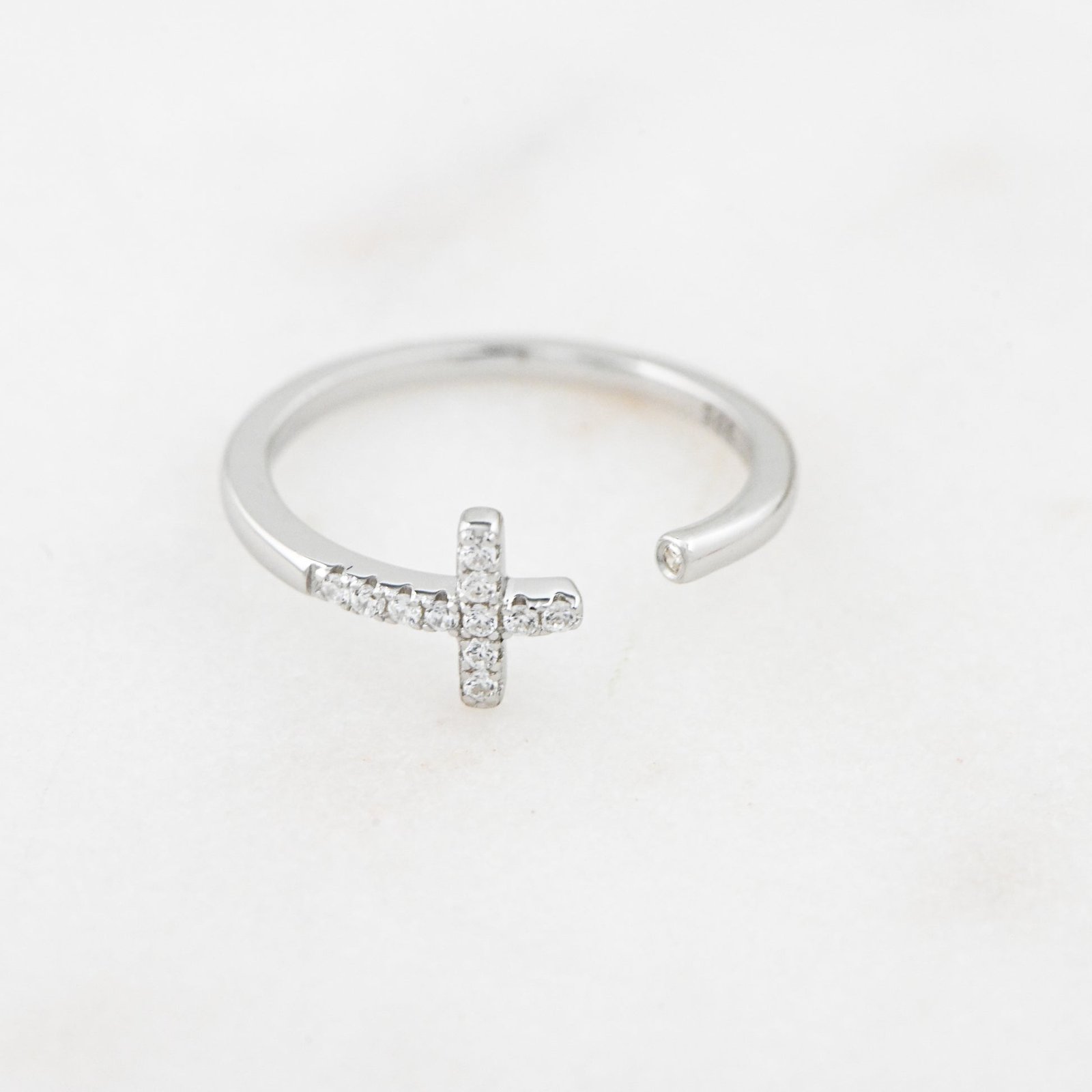 925 silver open cuff ring with pavé sideways cross (10mm), thick 14k gold or rose gold plating. Dainty, hypoallergenic, adjustable, and perfect for stacking or solo wear.