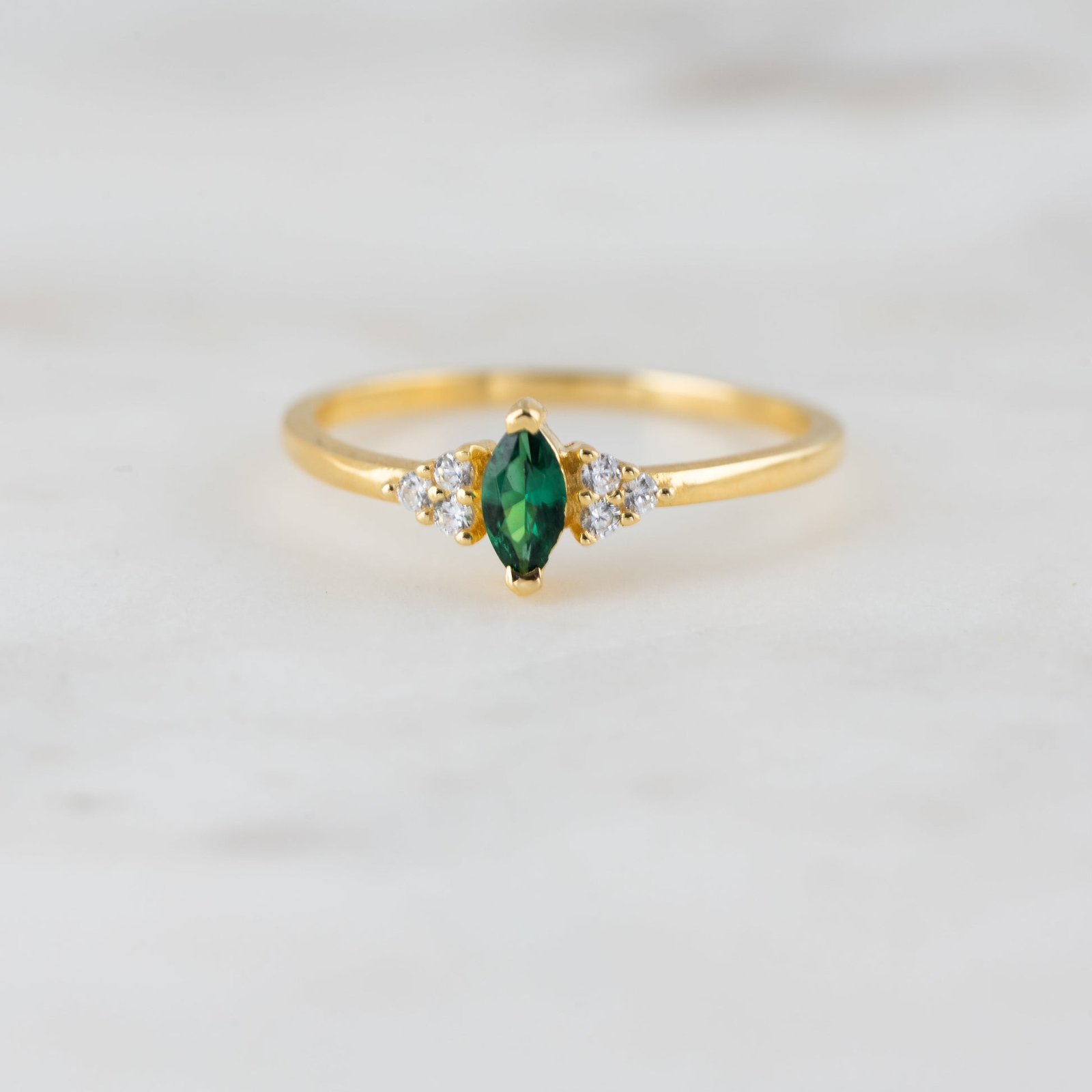 - A delicate Marquise Ring featuring 3 delicate CZ stones on either side of the stone. Dainty enough to stack, but carries enough punch to wear alone as well Super chic and high quality