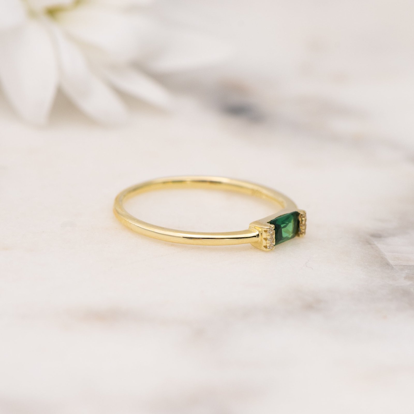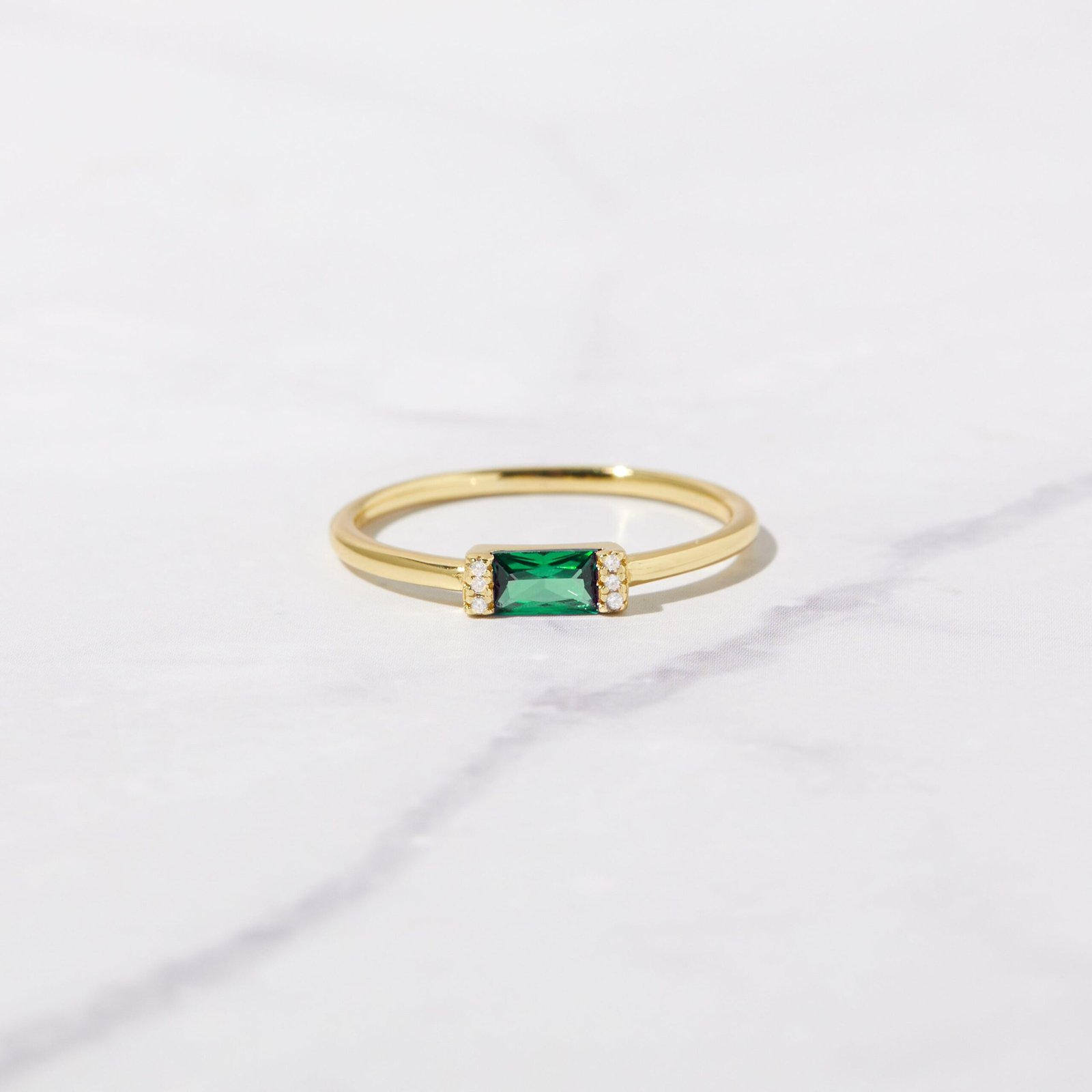 925 silver emerald baguette ring with a 1.3mm band and thick 14k gold plating. Dainty, hypoallergenic, and available in all birthstone colors.