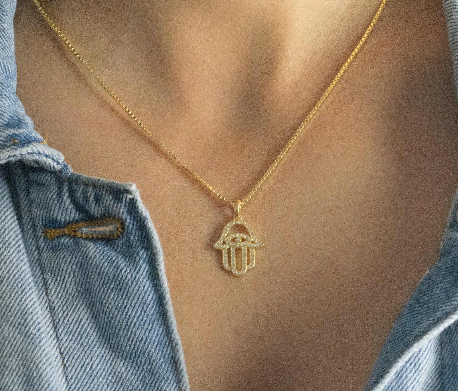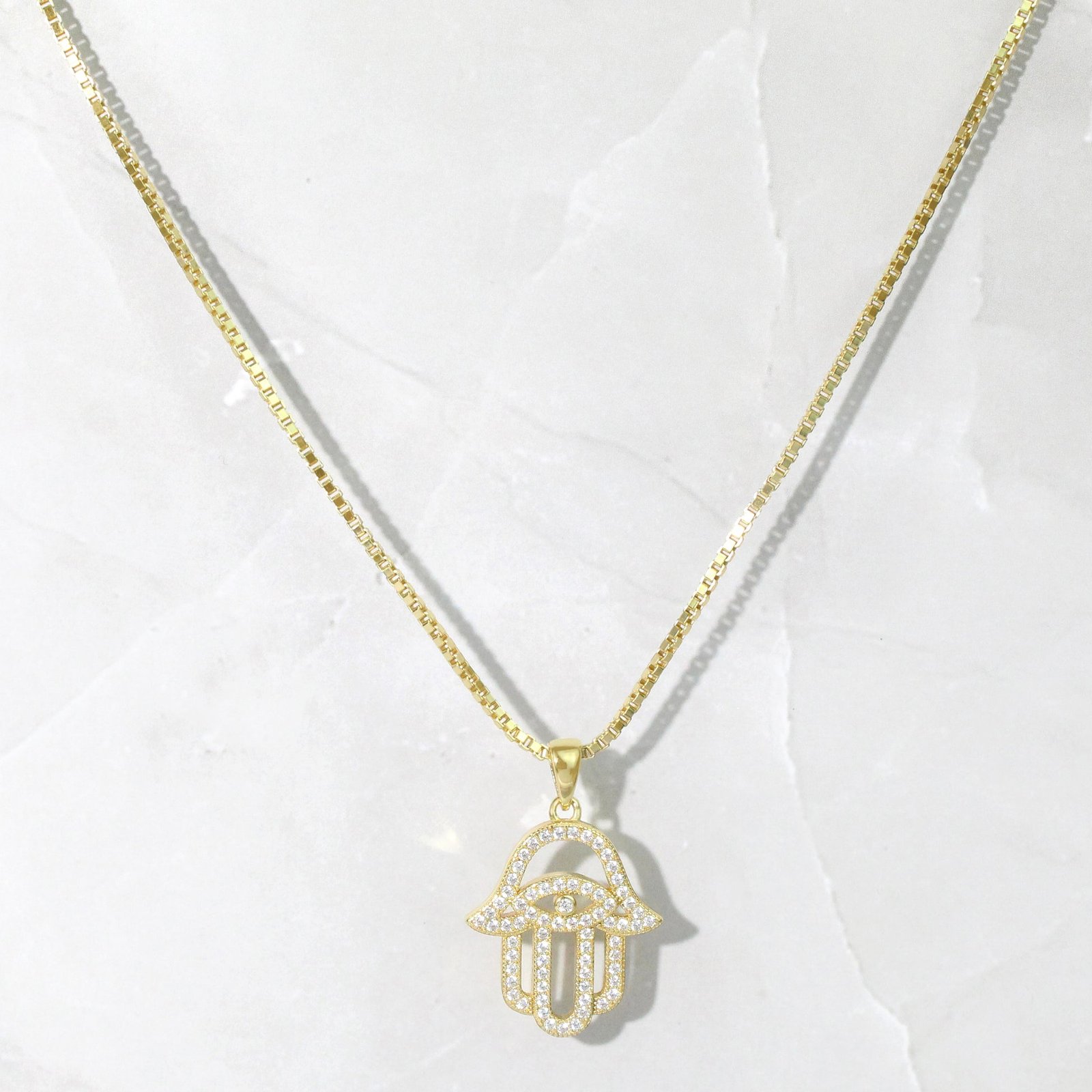 Hamsa evil eye necklace in 925 silver with CZ sparkle and 14k gold or rose gold plating. Hypoallergenic, meaningful, and perfect for daily wear.