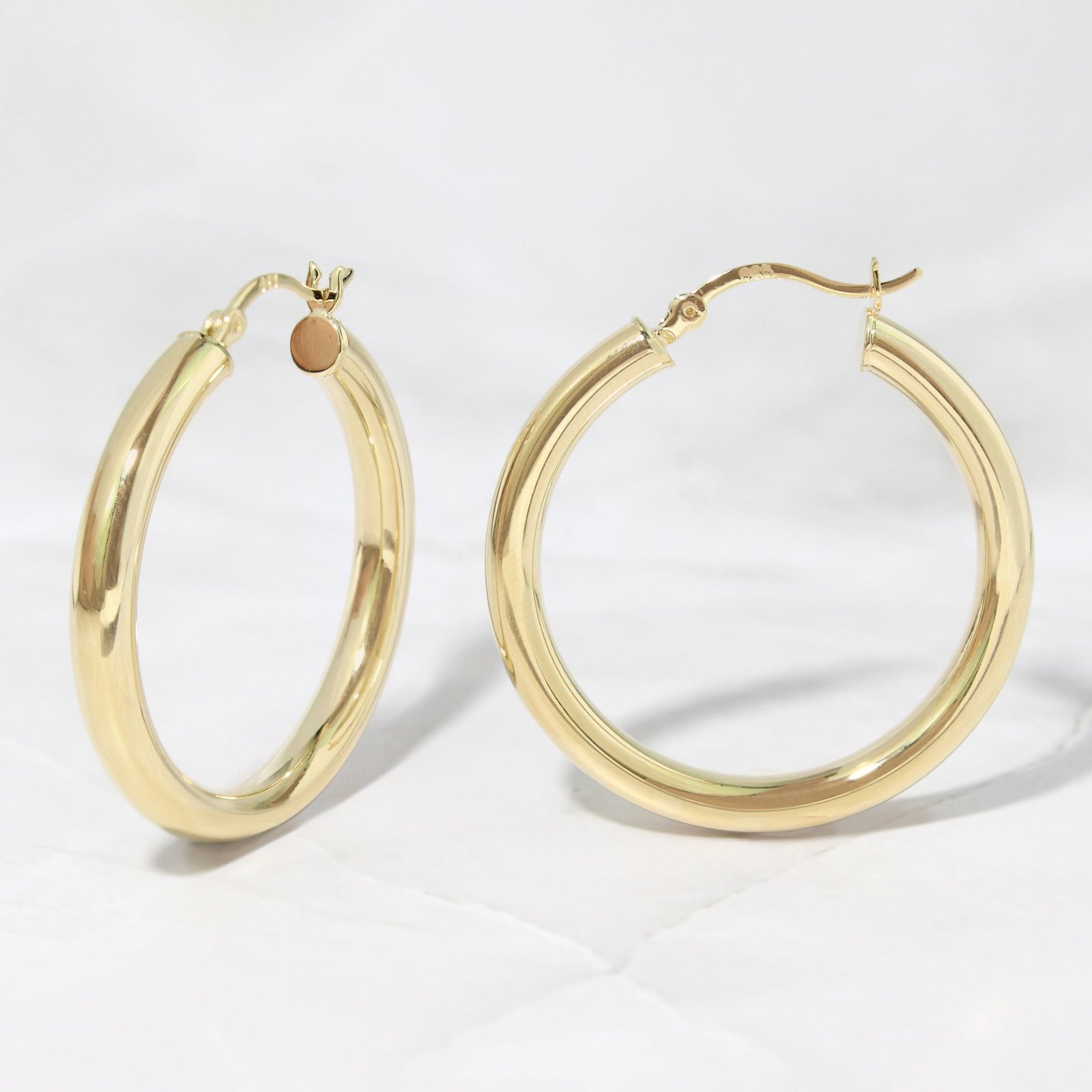 Classic 925 silver hoop earrings with 14K gold or rose gold plating. 34mm diameter, lightweight, hypoallergenic, perfect for everyday wear.