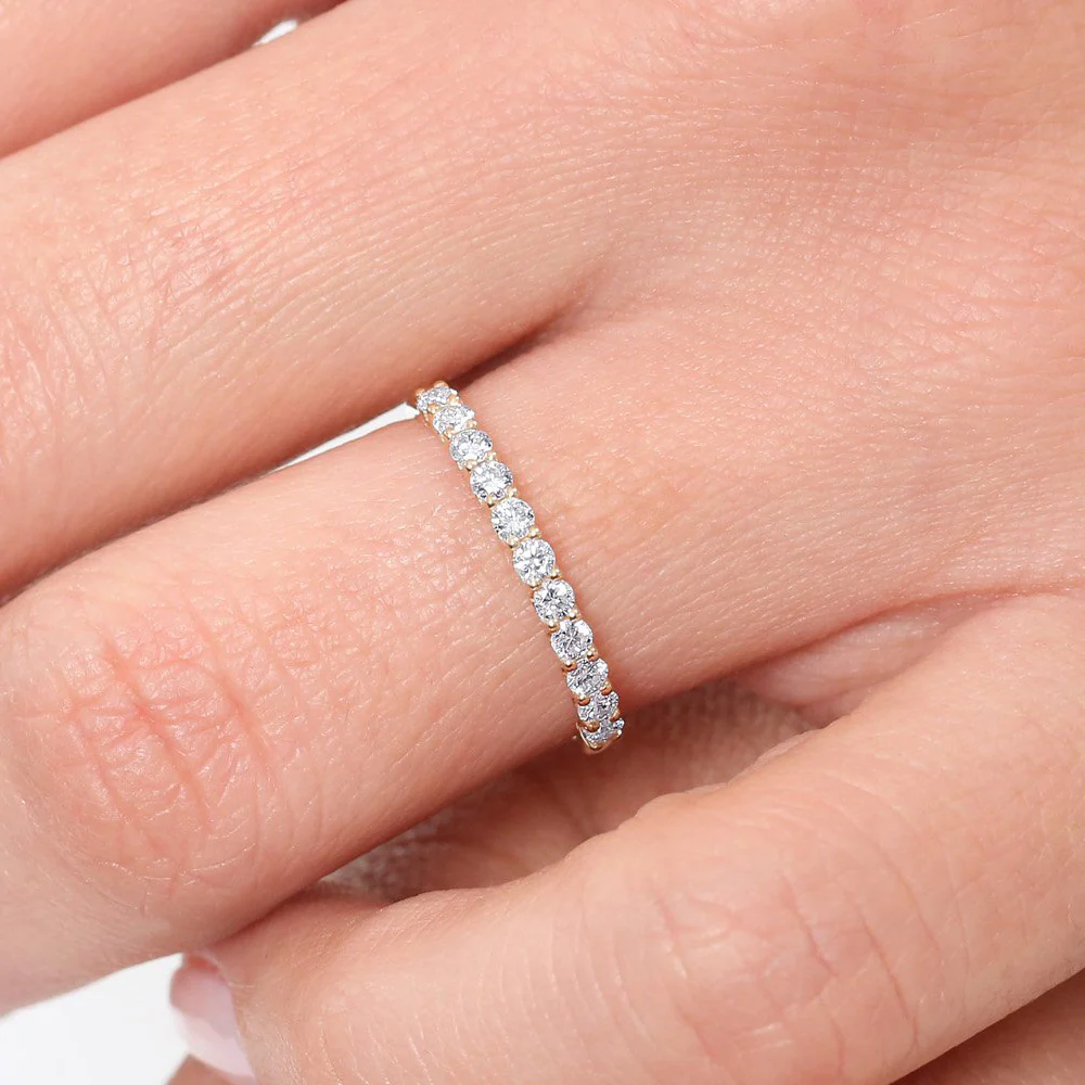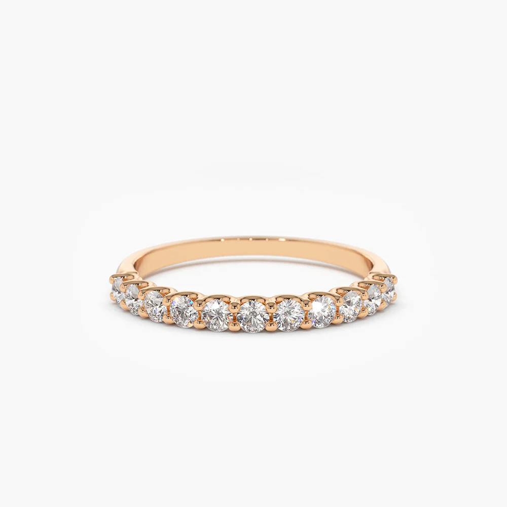 925 silver wedding band with 11 sparkling cubic zirconia stones in a graceful U-shape, finished in 14K gold or rose gold. Hypoallergenic and skin-safe.