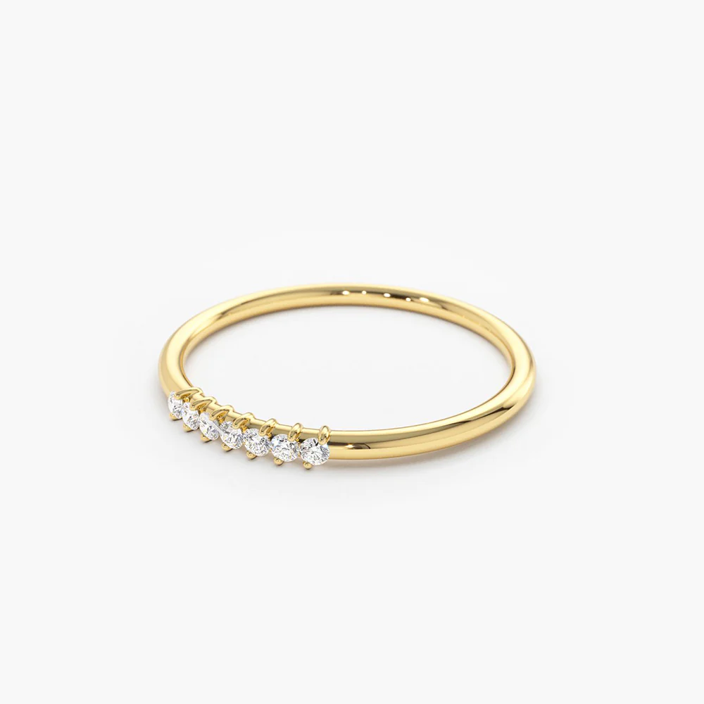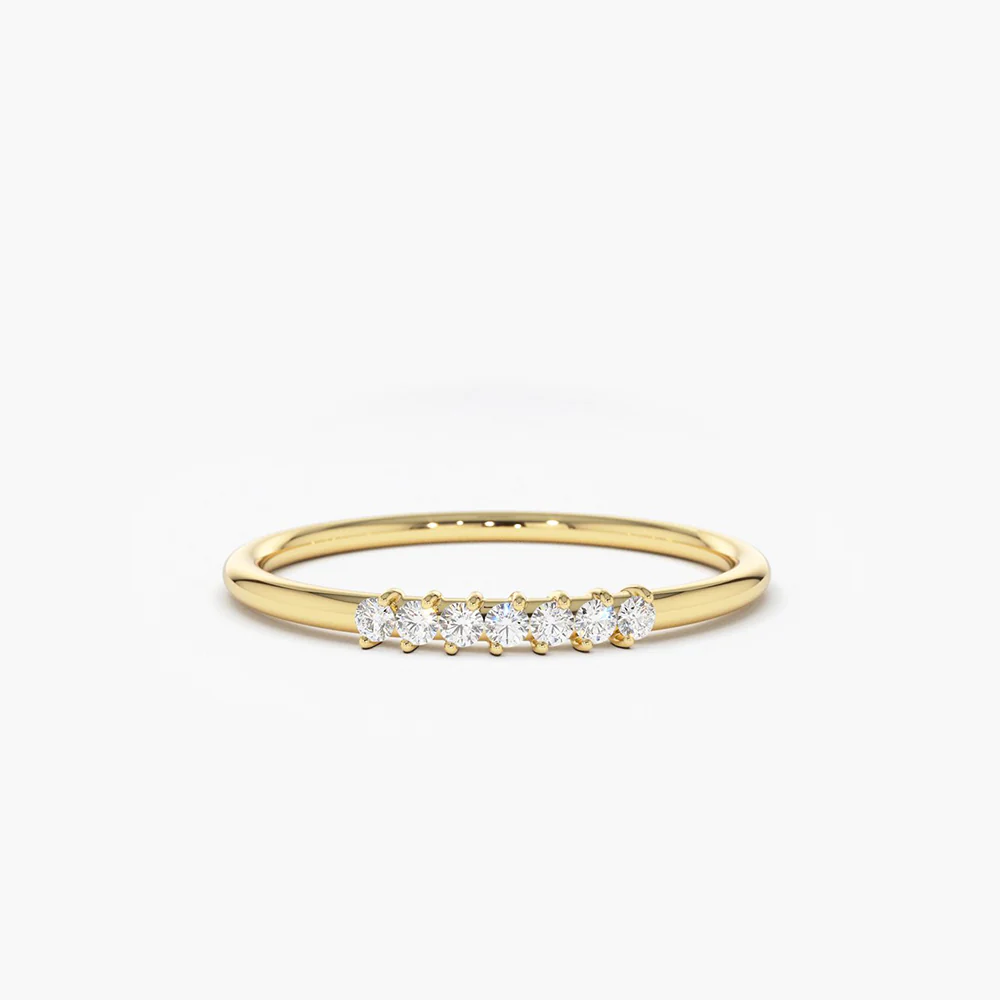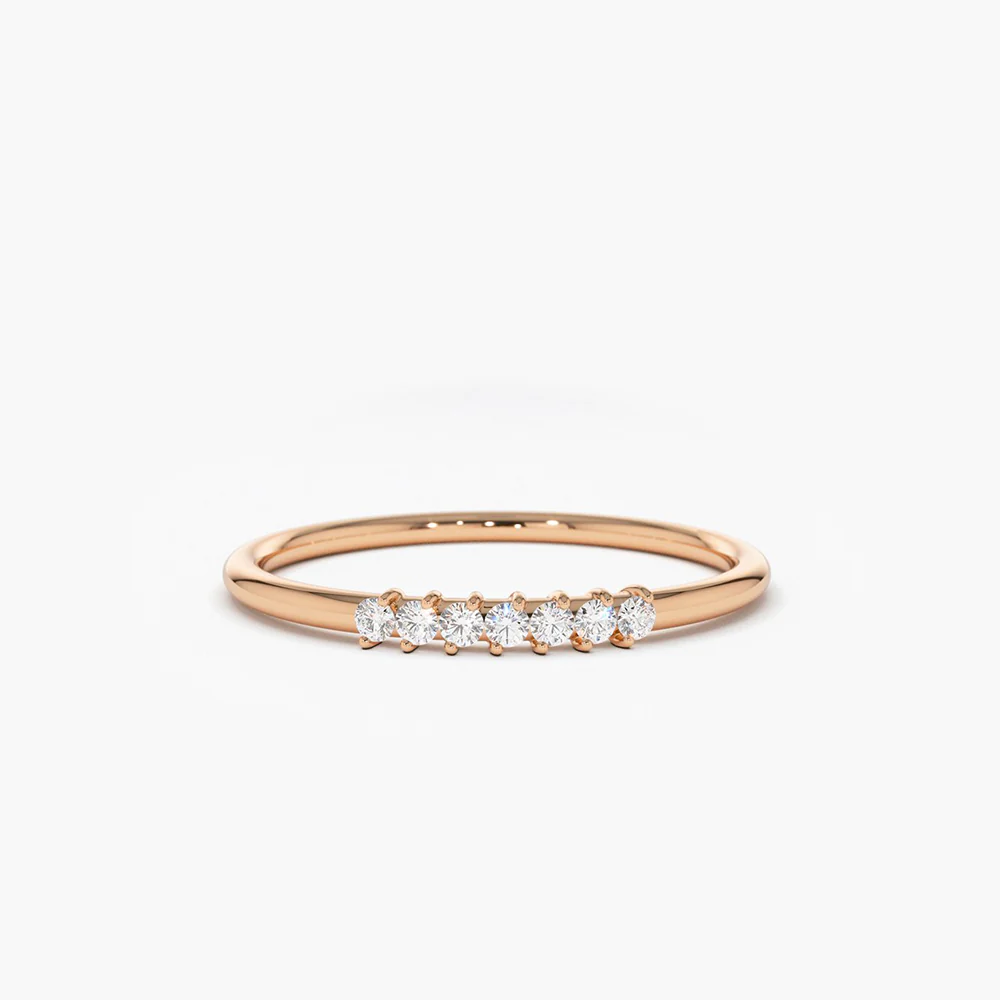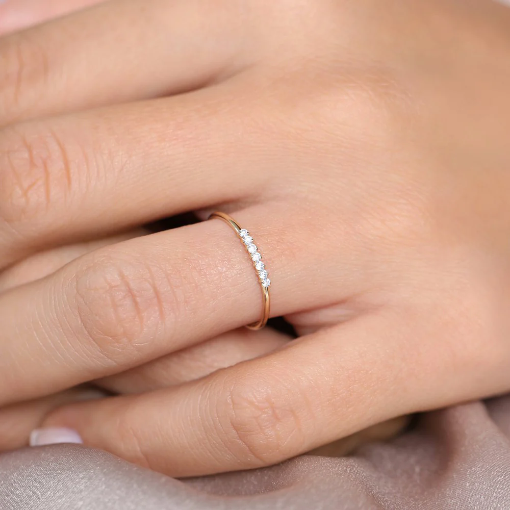 The design features seven meticulously set, brilliant-cut cubic zirconia stones, chosen for their exceptional clarity and diamond-like sparkle. Each stone represents a promise, a moment, or a shared dream—making this ring not only beautiful but also deeply meaningful. Its slender silhouette allows for effortless stacking or solo wear, adding understated glamour to your everyday look or bridal ensemble.