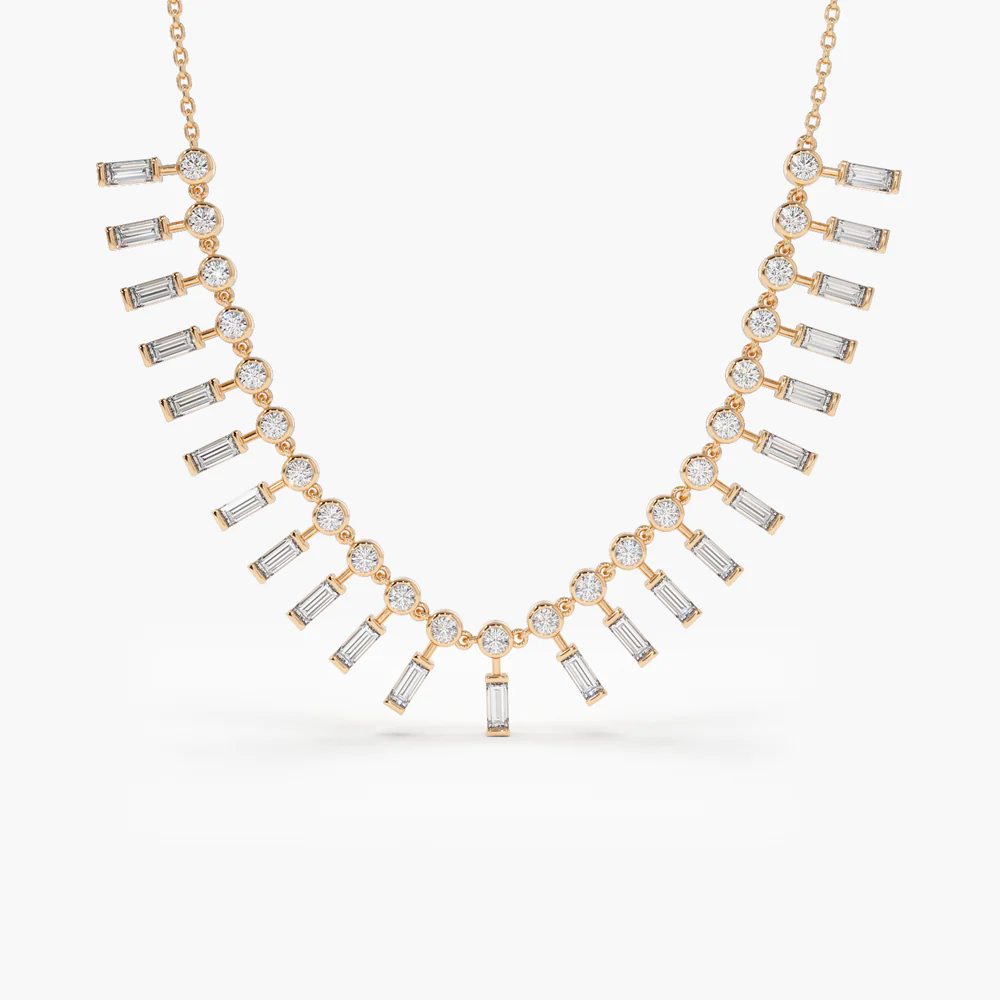 Crafted from high-quality 925 sterling silver and coated with thick, durable 14K gold or rose gold plating, the necklace delivers long-lasting shine and luxurious appeal. The combination of sleek baguettes and radiant rounds adds depth and dimension to your neckline, making it perfect for evening wear or high-impact styling.