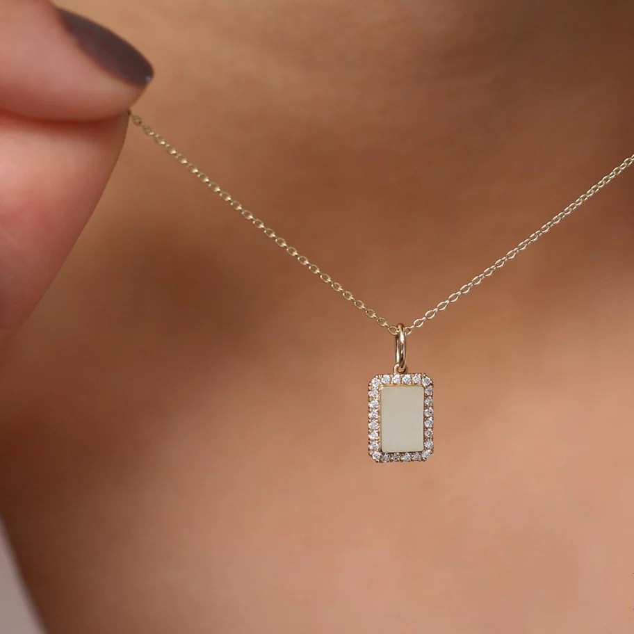 Plated with thick, durable 14K gold or rose gold, the necklace radiates a polished, luxurious finish that complements its bold shape. Whether layered or worn solo, the tag-style pendant makes a stylish statement while adding a personalized touch to your everyday look.