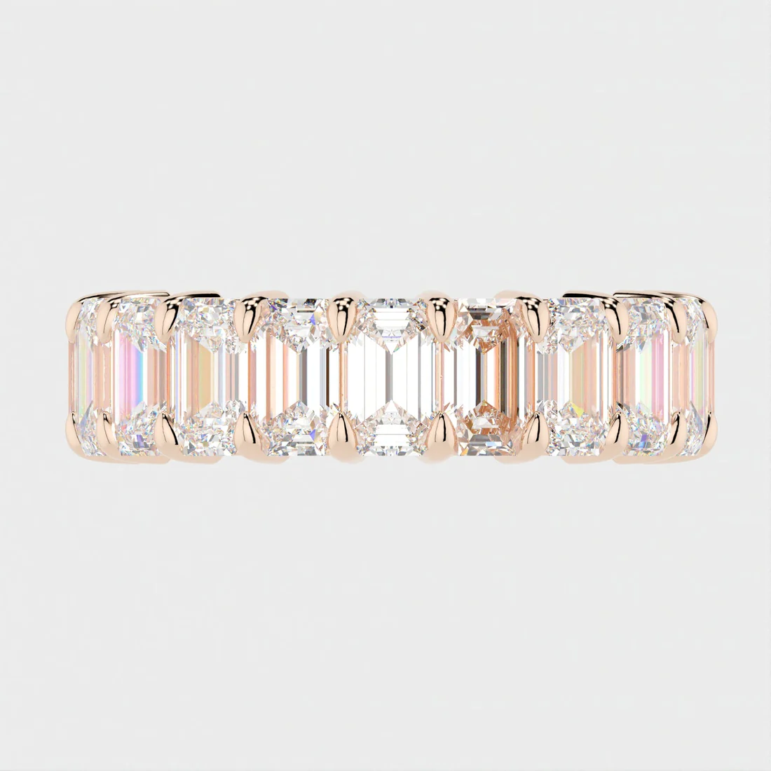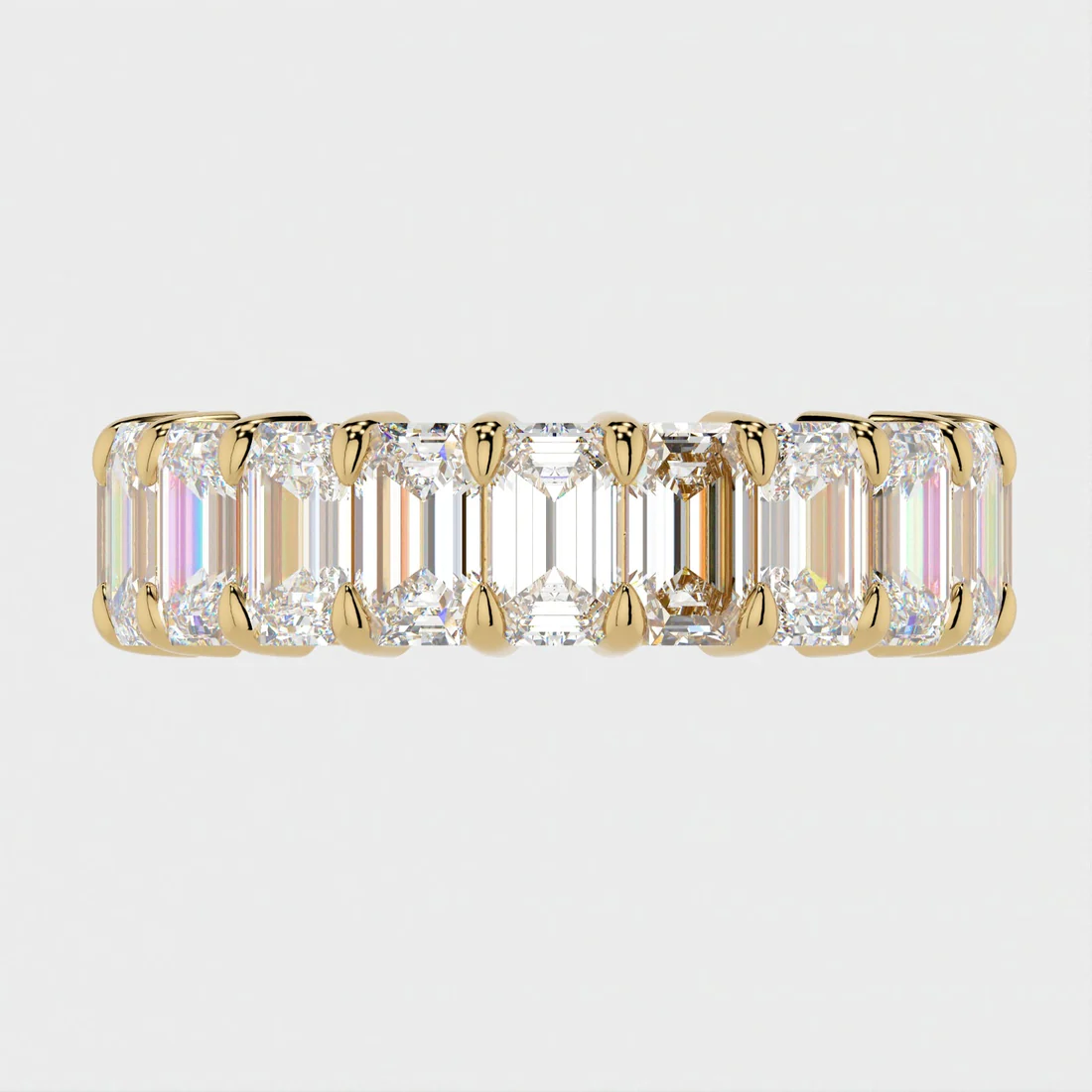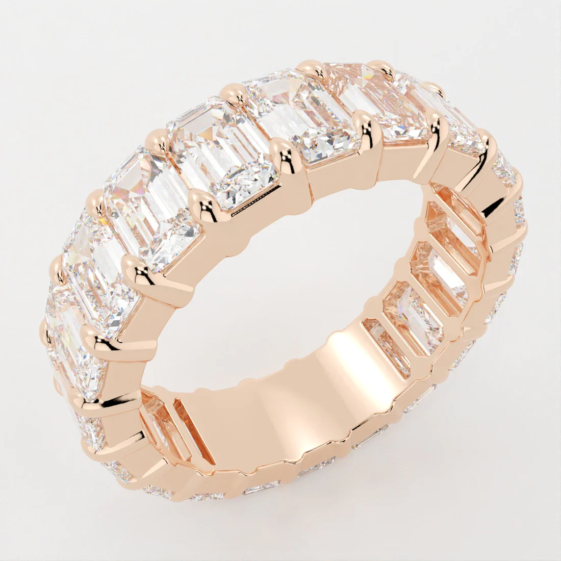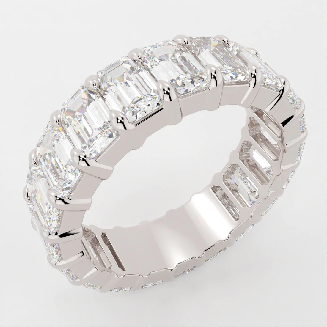 Encircling the entire band are perfectly aligned emerald-cut cubic zirconia stones, each cut for a refined, mirror-like sparkle. The geometric elegance of the emerald cut brings a vintage-inspired charm that’s both classic and bold. Whether worn alone or stacked with other favorites, this eternity band radiates sophistication from every angle.