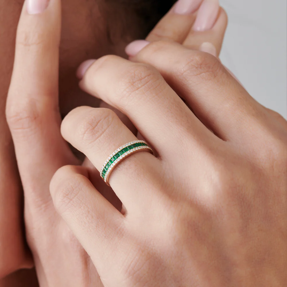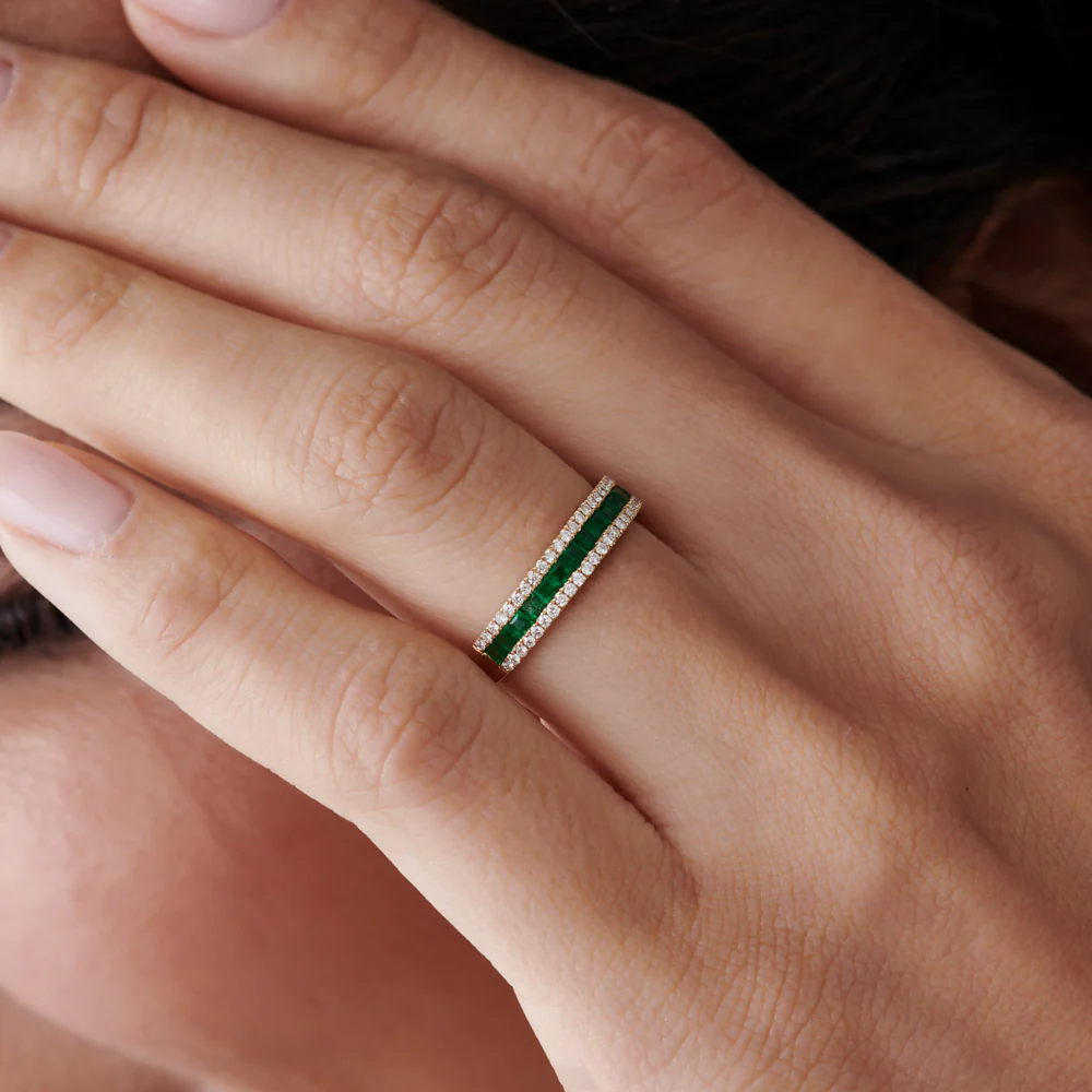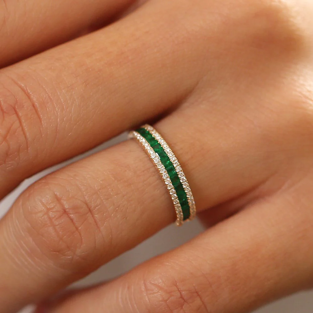 Crafted in high-quality 925 sterling silver and coated with a thick, durable layer of 14K gold or rose gold, this ring shines with lasting brilliance. Each emerald stone is accented with diamond-like Cubic Zirconia, perfectly set to maximize sparkle while maintaining a sleek, modern silhouette.