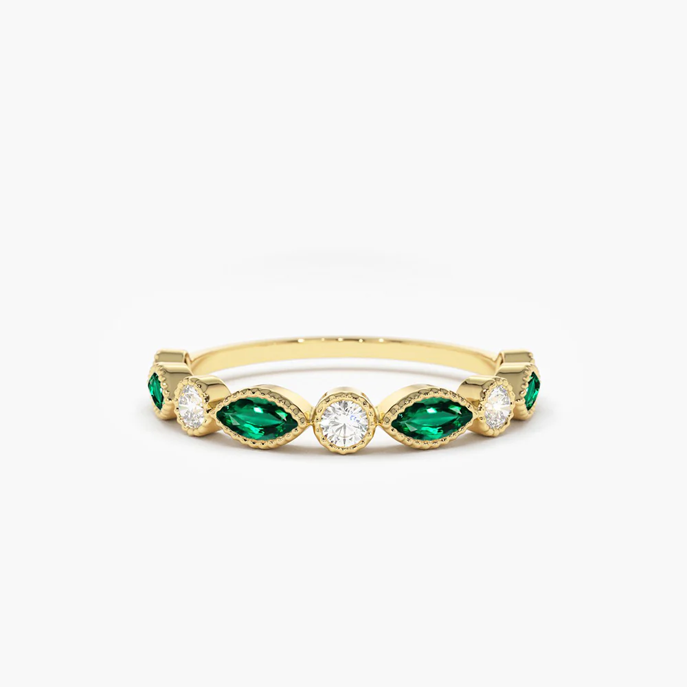 The design features alternating marquise-cut emerald-hued cubic zirconia and round diamond-like stones, creating a beautiful rhythm of color and sparkle. The marquise stones add a vintage-inspired flair with their elongated shape and pointed tips, while the brilliant round stones bring soft shimmer and balance. This harmonious combination makes the band perfect for wedding ceremonies, anniversaries, or as a standout piece in your everyday stack.