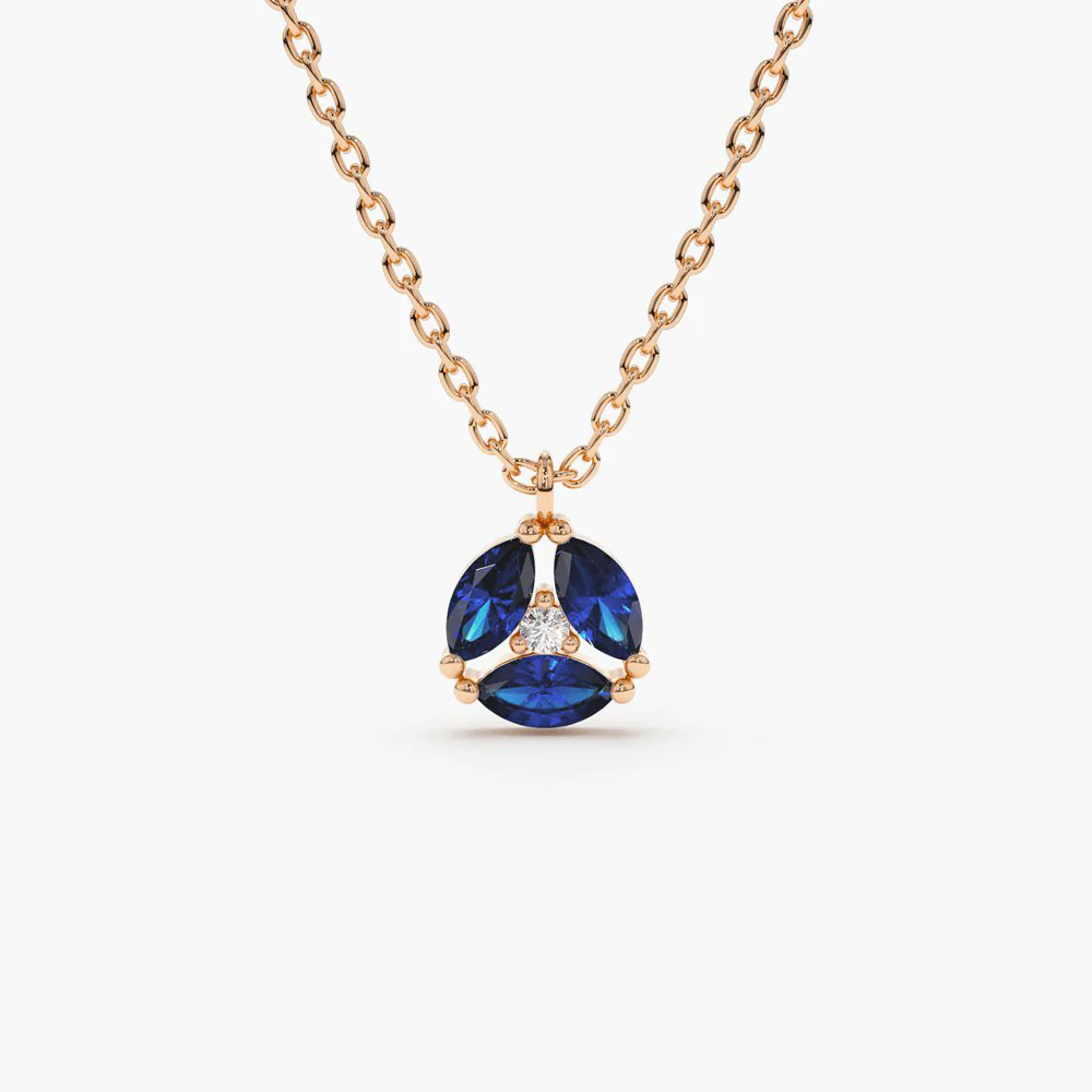 925 silver necklace with marquise sapphire stones and CZ accents, finished in 14K gold or rose gold. Hypoallergenic, elegant, and full of color.