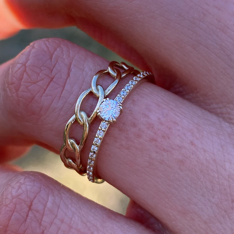 925 silver double ring with chain detail and sparkling CZ stones. Finished in thick 14K gold or rose gold plating. Edgy, elegant, and hypoallergenic.