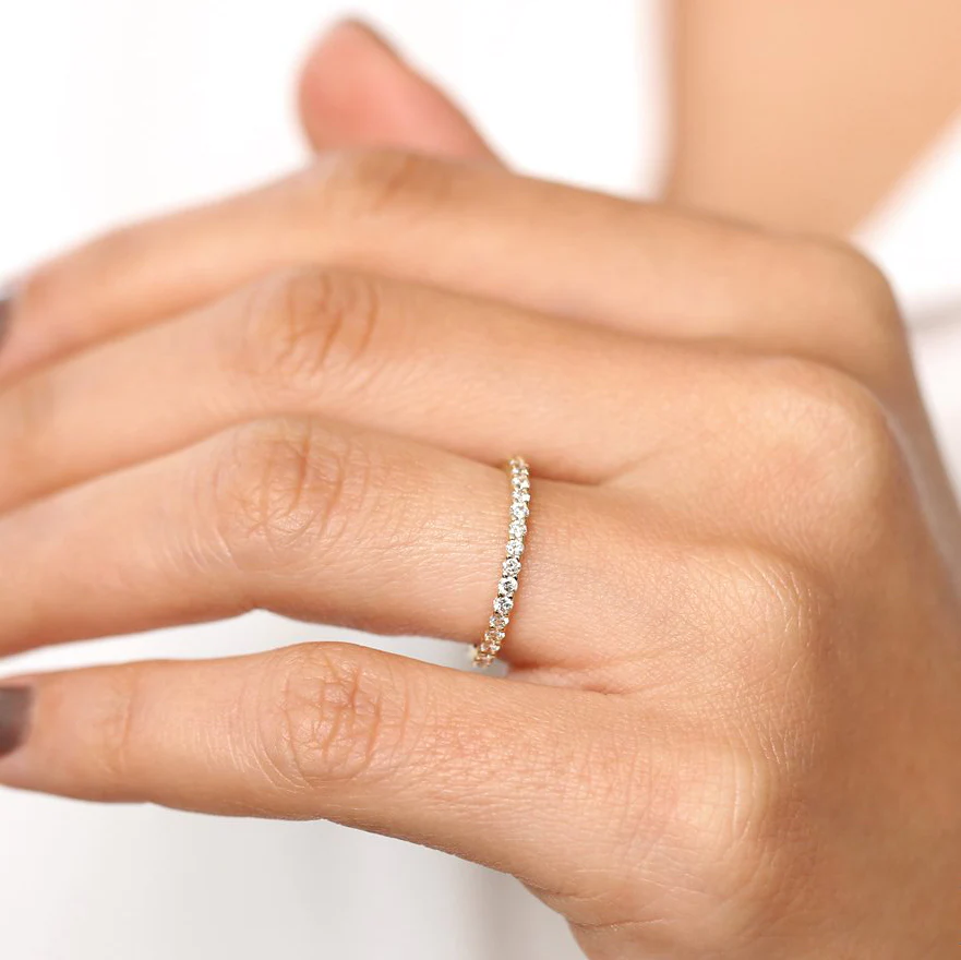 Elegant 925 sterling silver minimalist eternity ring with sparkling CZ stones and durable 14K gold or rose gold plating. Hypoallergenic and ships in 7–8 business days.
