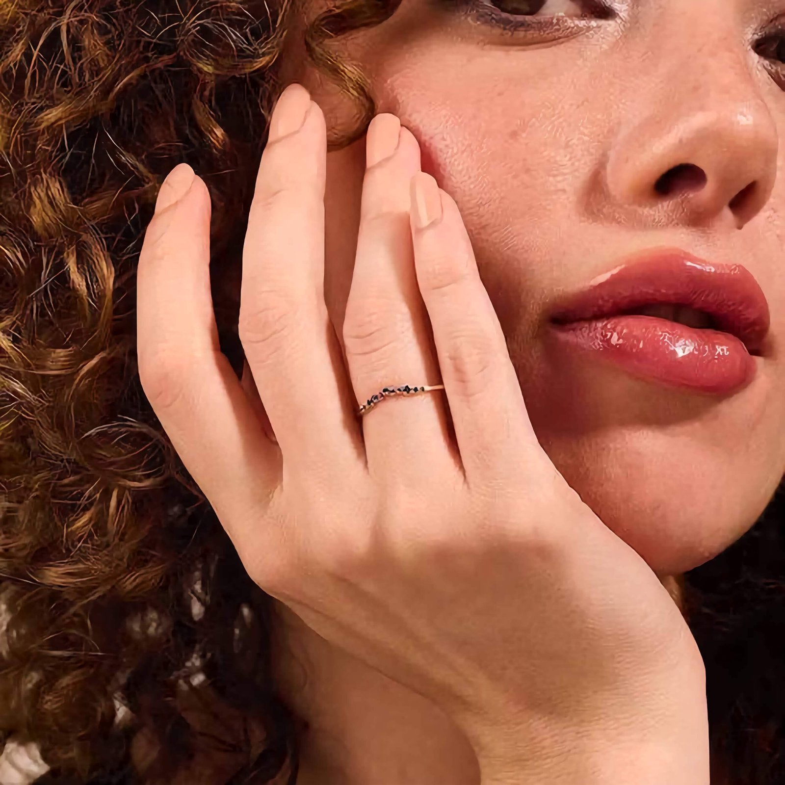 Dainty curved ring in 925 Sterling Silver with sapphire CZ stones and thick 14K Gold or Rose Gold plating. Nickel-free and hypoallergenic.