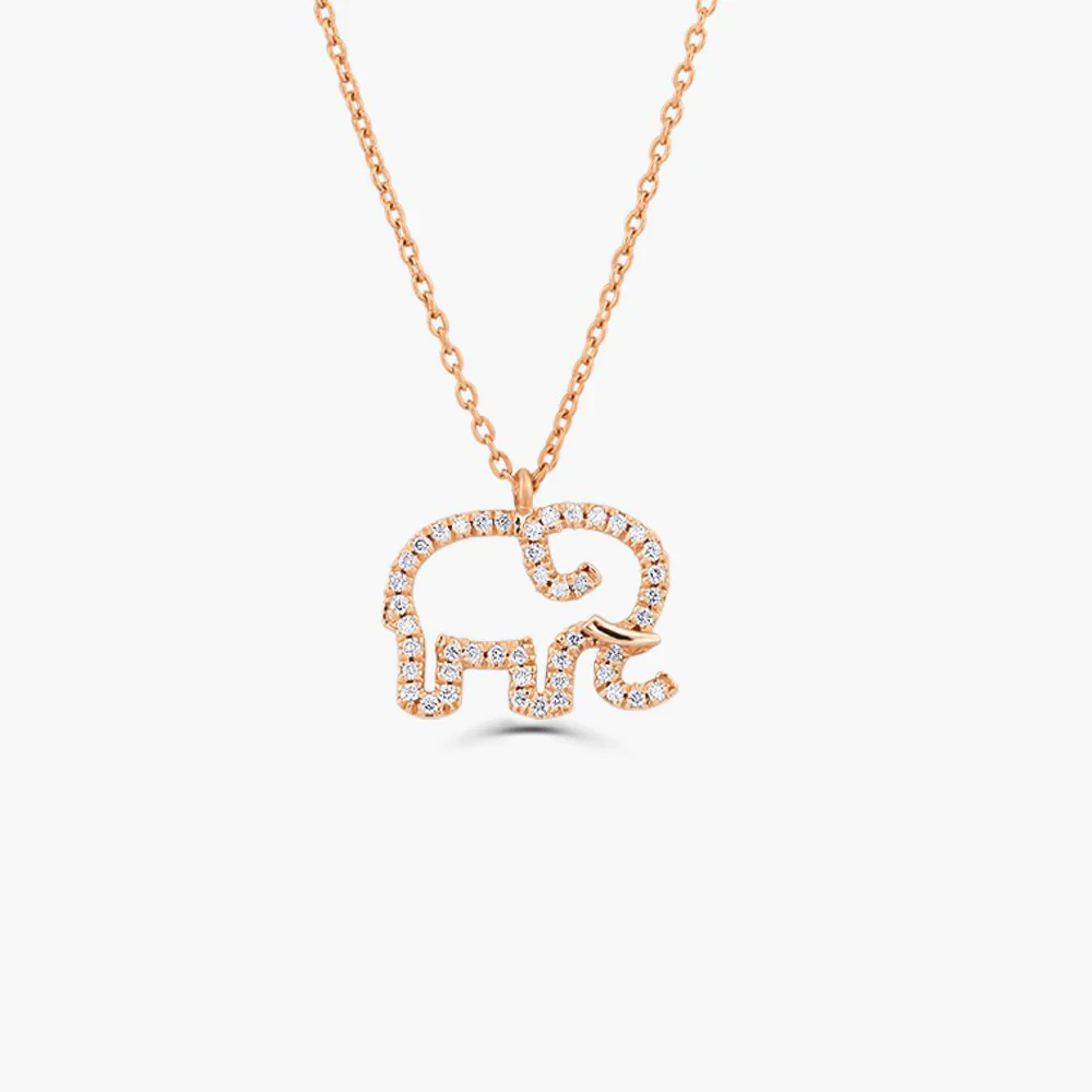 925 silver elephant charm necklace with CZ stones, in 14K gold or rose gold. Hypoallergenic, nickel-free, and rich in symbolism.