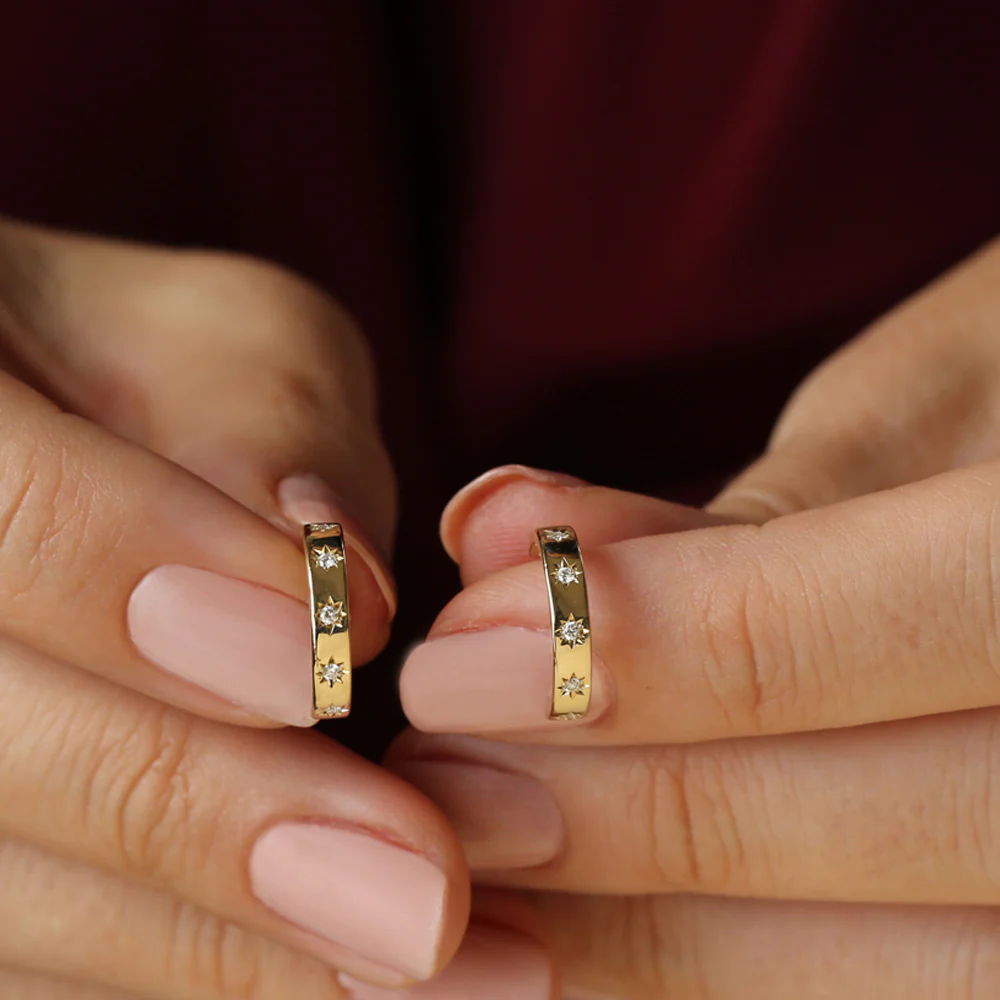 Each hoop is adorned with the finest quality Cubic Zirconia stones, delivering a dazzling, diamond-like sparkle in a lightweight and comfortable design. The nickel-free and hypoallergenic construction ensures these hoops are safe for sensitive skin, making them ideal for everyday wear. Whether worn solo for a subtle statement or layered with other earrings for a trendy, stacked look, these star hoops bring effortless charm and sparkle to any outfit.