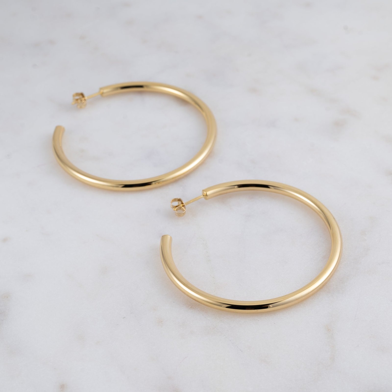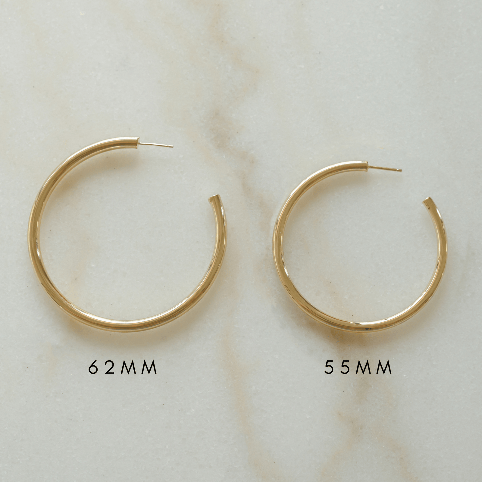 Expertly crafted from premium 925 sterling silver, these hoops are coated with a thick, durable layer of 14K gold plating, giving them a radiant, long-lasting shine. Despite their larger diameter—available in 55mm or 62mm—they remain incredibly lightweight, ensuring all-day comfort without tugging or irritation. Their sleek 3.5mm thickness offers a bold yet refined silhouette that flatters every face shape.