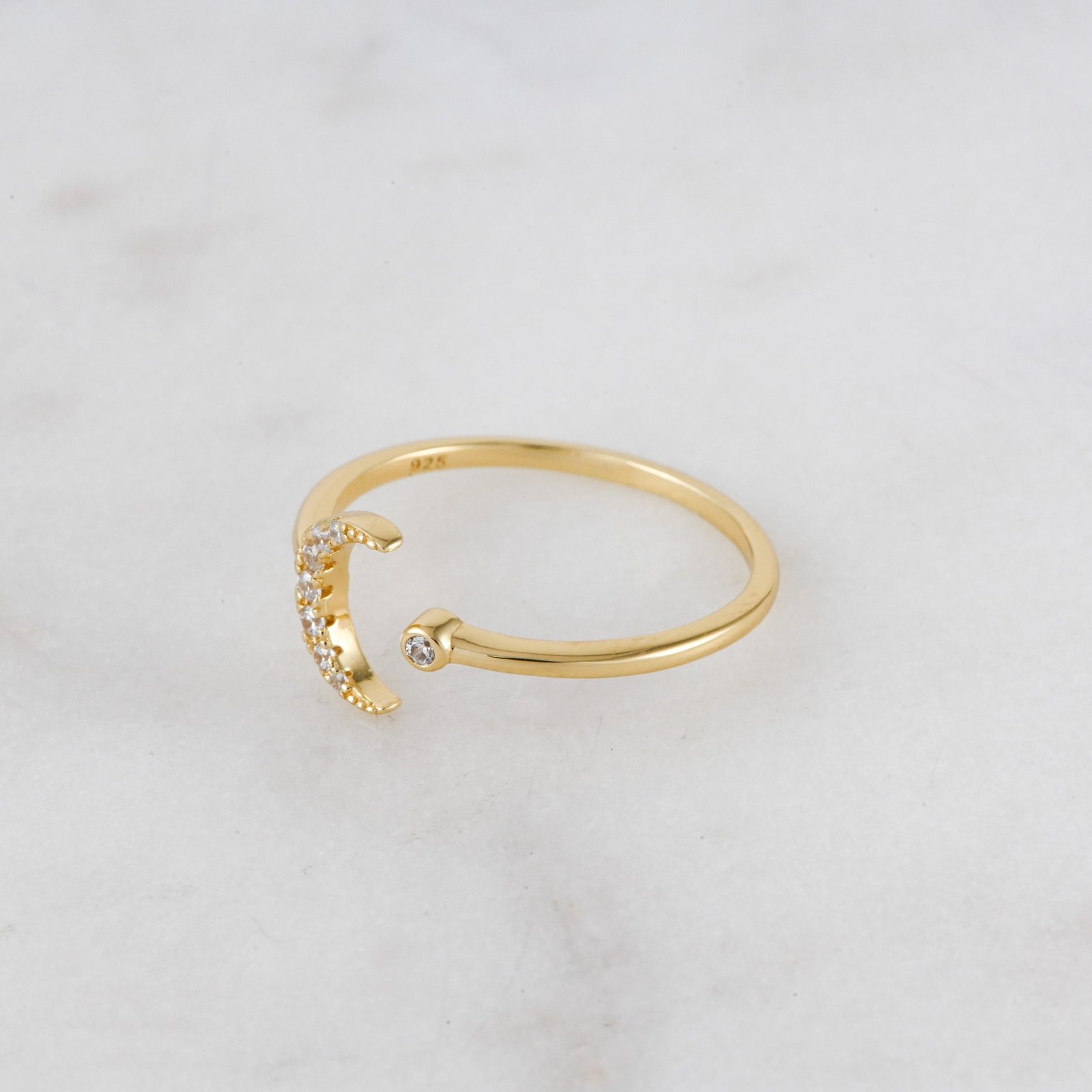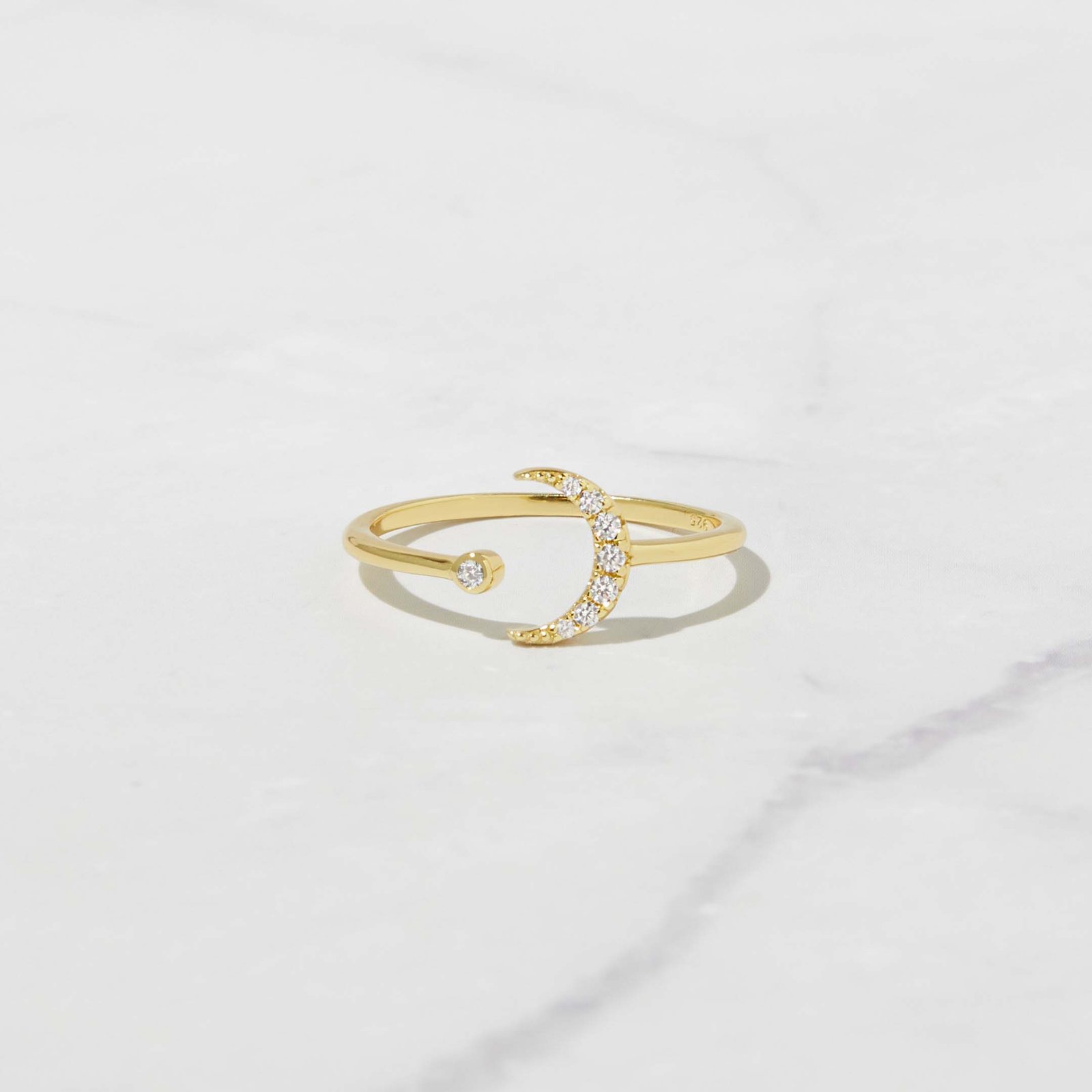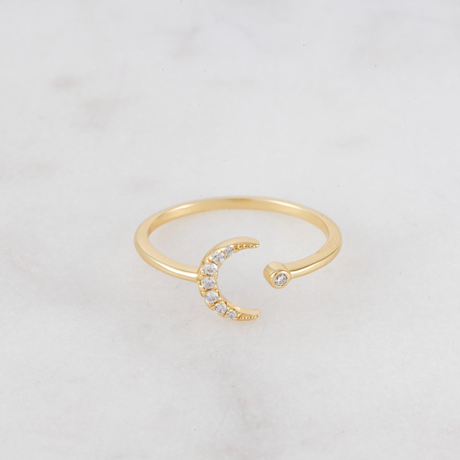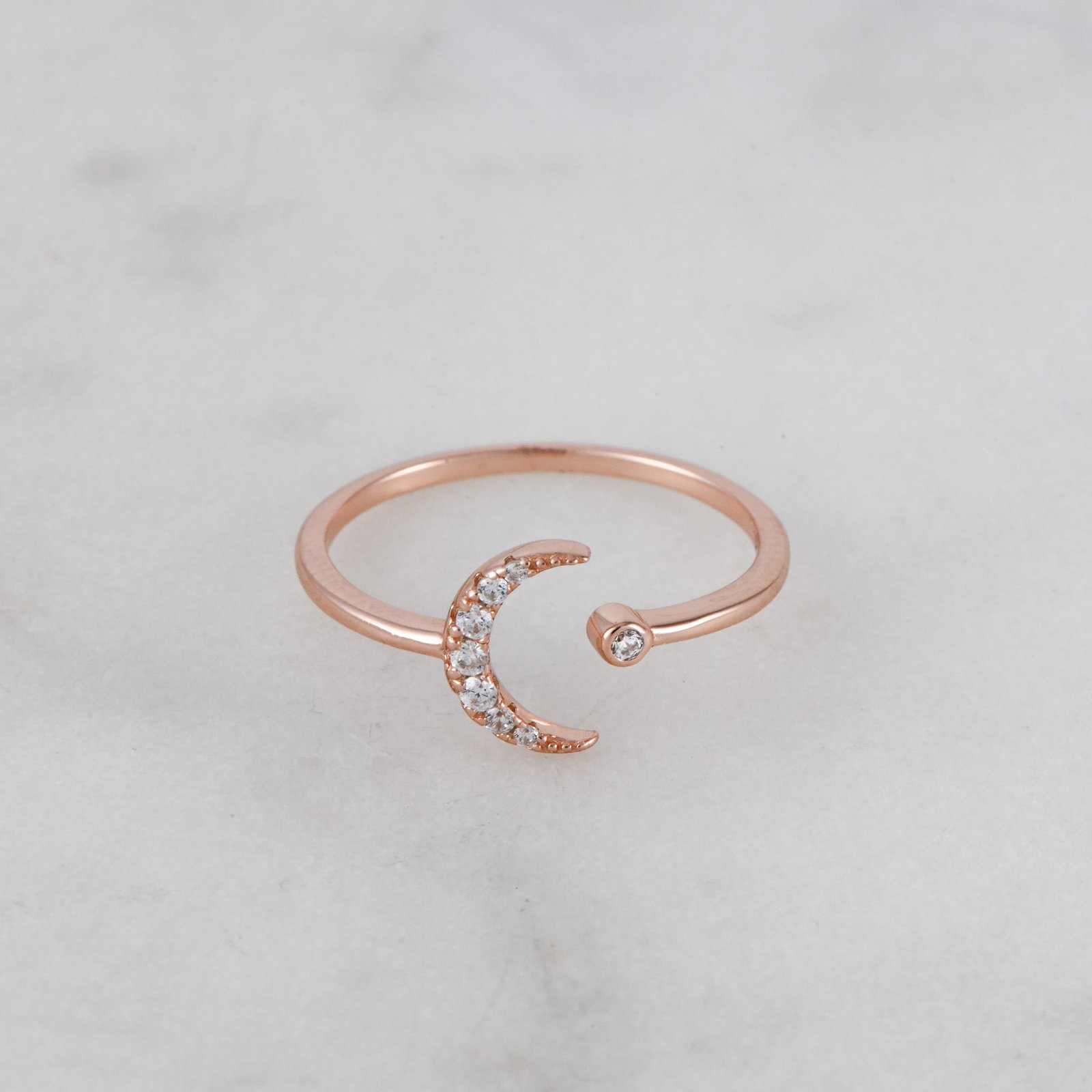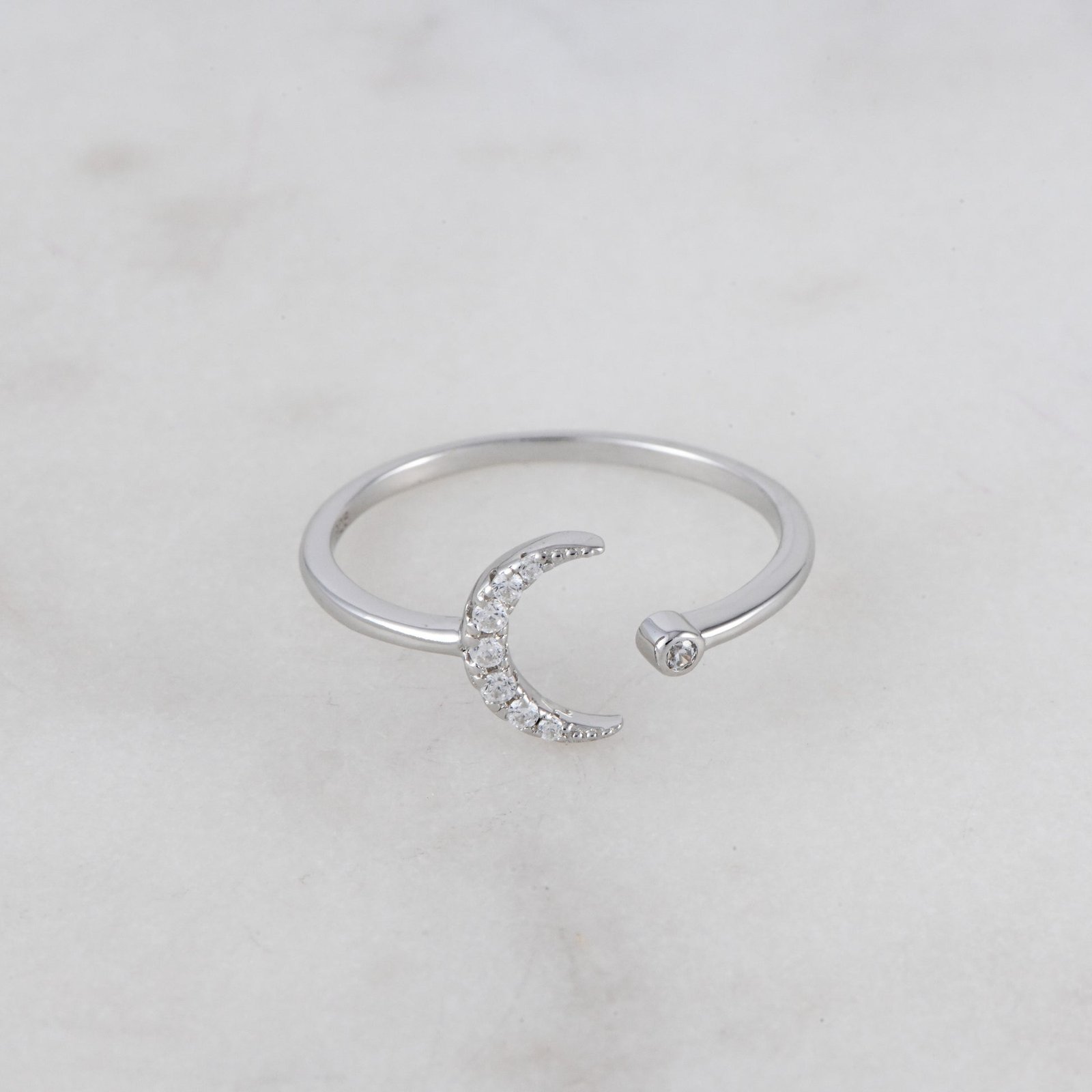 Elegant 925 Silver Moon Ring with highest-grade CZ stones. 14K Gold/Rose Gold plating, adjustable, Nickel-free, and hypoallergenic.